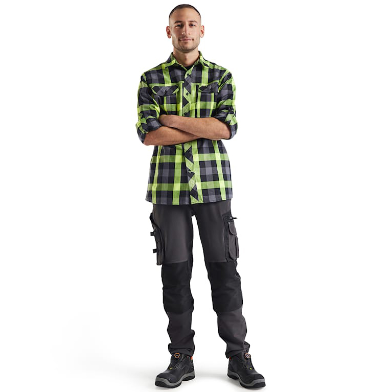 Měkká a stylová flanelová košile Blakläder volného střihu je ideální volbou pro práci i volný čas. Má klasický kostkovaný vzor v černo-žluté reflexní kombinaci, který dodává moderní a výrazný vzhled. Z vnitřní strany je jemně počesaná, což zaručuje příjemné teplo a pohodlí i při celodenním nošení. Praktické provedení doplňují dvě náprsní kapsy s klopami, přičemž levá kapsa je vybavena otvorem na tužku. Plastové knoflíky dokonale ladí s celkovým designem a podtrhují ležérní, ale funkční styl této klasické flanelové košile. Hlavní materiál tvoří 82 % bavlna a 18 % polyester, jednostranně počesaný flanel o gramáži 180 g/m2 poskytuje měkkost, odolnost a dlouhou životnost.