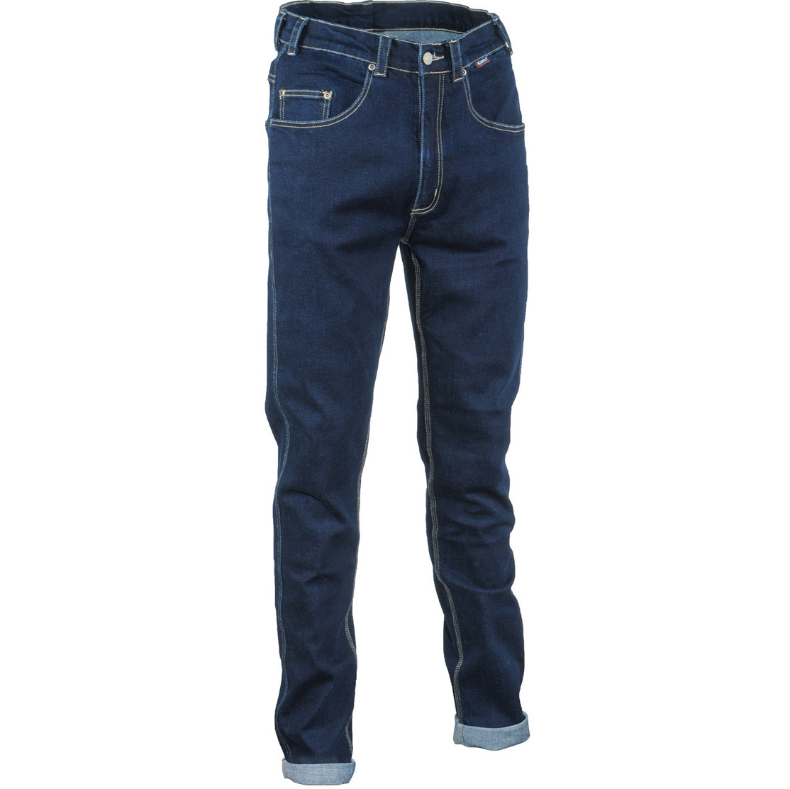 2 zadní kapsy, 2 přední kapsy, kapsa na mince, manžety na spodní straně kalhot, dobrá odolnost proti oděru, dobrá odolnost proti praní, nýty a cvočky v nejvíce namáhaných oblastech, aby byla zaručena trvanlivost, strečová tkanina, trojité prošívání části podléhající opotřebení, YKK® zip