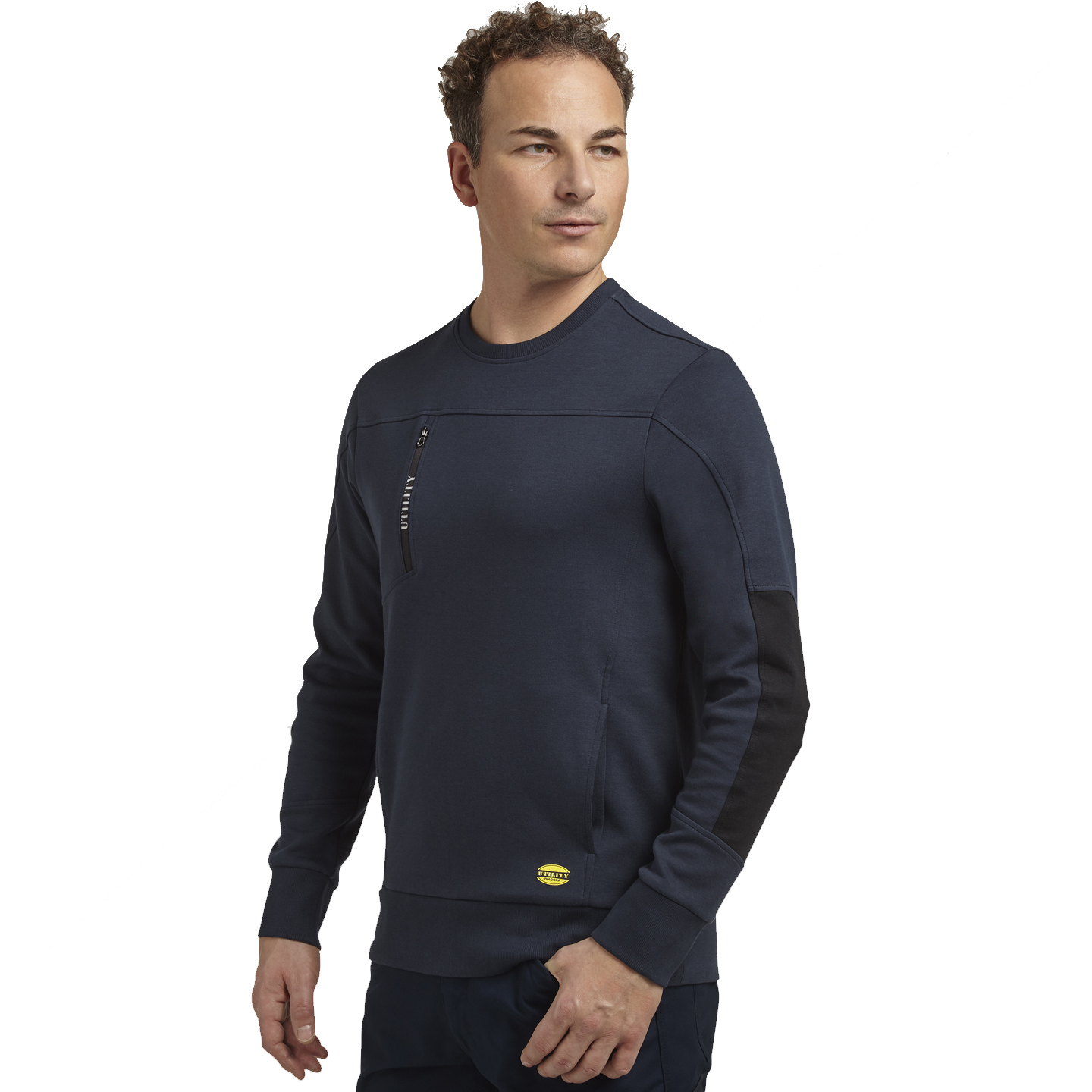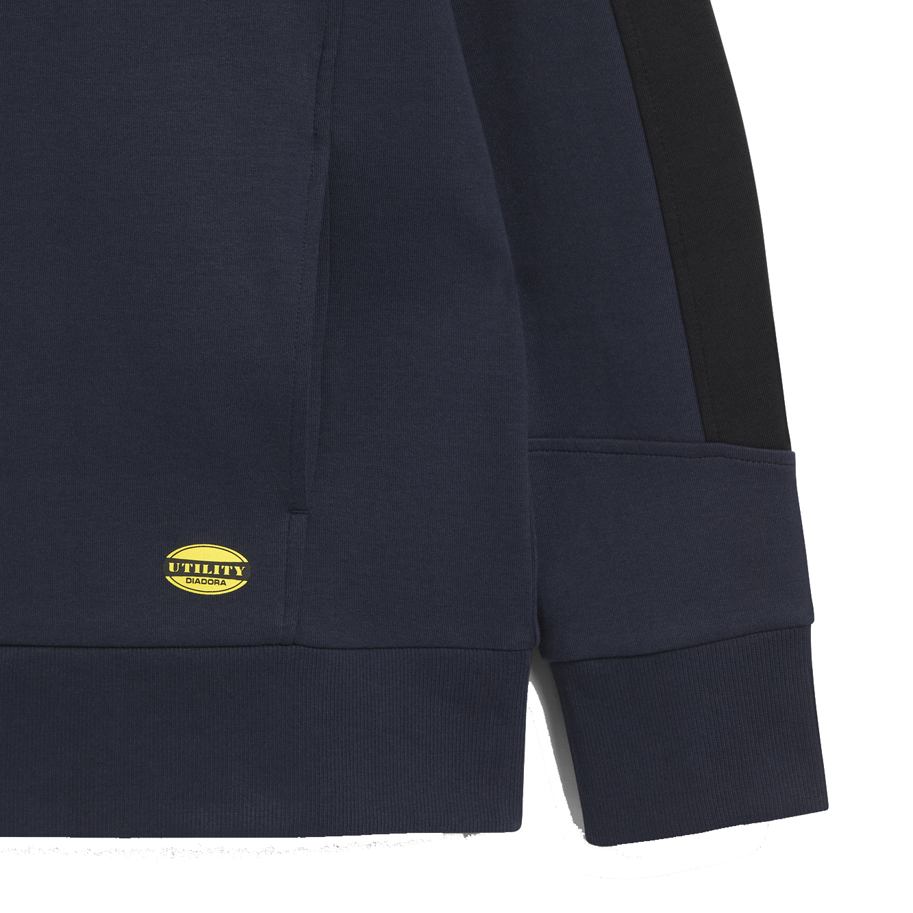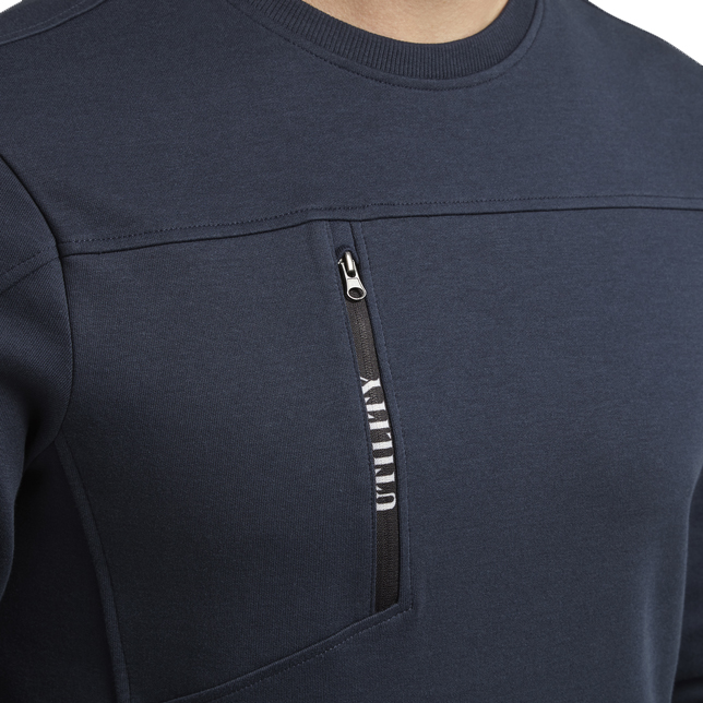 Lehká interlocková mikina s posádkovým výstřihem a černými bočními vsadkami na rukávech. Ergonomické rukávy. Dvě otevřené boční kapsy a přední kapsa na zip. Strečový žebrovaný úplet krku, manžet a spodního lemu. 80% Bavlna 20% Polyester
