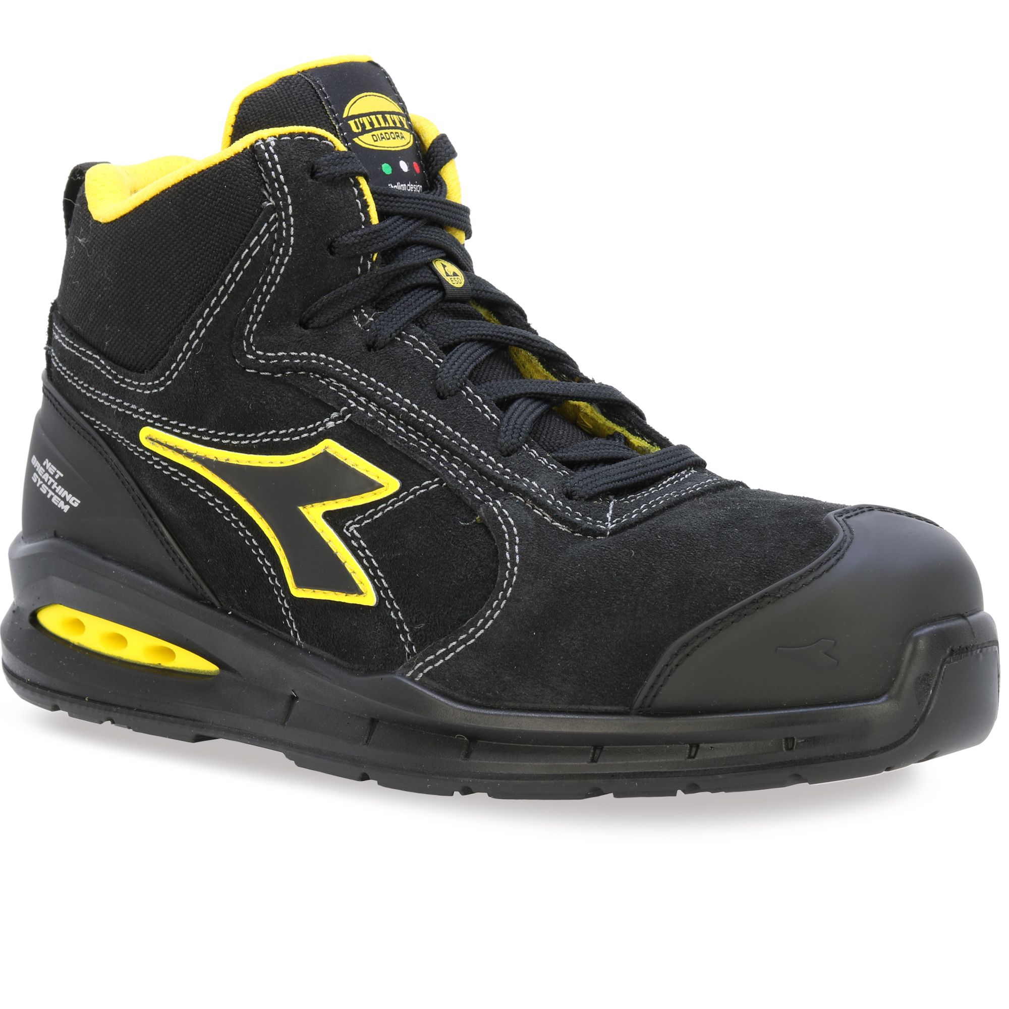 Bota, která dýchá! Nízká bezpečnostní obuv S3 z voděodpudivého italského štípaného semiše s Net Breathing System od Geox na bocích. Hliníková tužinka 200J. Šířka 11. K PODRÁŽKA, oděruvzdorná a ultraprodyšná nylonová podšívka a vyjímatelná prodyšná stélka s aktivním uhlím. ESD. DÝCHACÍ SYSTÉM OD GEOX - AIRBOX: Diadora Utility rozšiřuje svou řadu produktů NET DÝCHACÍ SYSTÉM (licencovaný společností GEOX) a zavádí vlastní patentovanou technologii. Tato exkluzivní řada, vyvinutá ve výzkumných laboratořích Diadora, představuje dokonalost v oblasti inovací a designu. Tyto boty nechávají nohu volně dýchat a nabízejí maximální pohodlí v každé situaci. Inovativní boční poloha ventilačních otvorů v nové konstrukci Airbox zajišťuje bezkonkurenční prodyšnost. Speciální membrána GEOX Diadora byla nyní dále vylepšena přidáním otvorů po stranách, které zajišťují maximální prodyšnost pro nohu a zároveň zůstávají v dokonalé harmonii s ochrannými prvky, které tvoří botu. Výzkum potvrdil, že tato membrána – která obsahuje drobné dírky nebo „mikropóry“, které jsou menší než kapka vody, ale větší než molekula vodní páry – zabraňuje pronikání vody do boty a zároveň zajišťuje, že noha zůstane suchá.