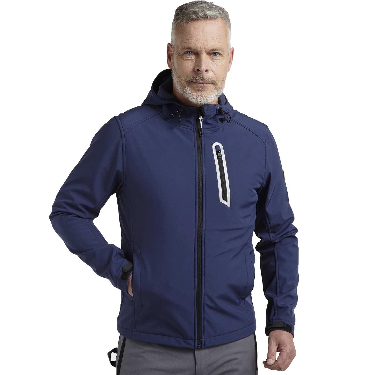 Softshellová bunda, 3 přední kapsy na zip s jednou náprsní kapsou, reflexní detaily, nastavitelná kapuce. Nastavitelné manžety. Vodní sloupec: 3000 mm. Odolnost proti větru: 3000 mvp