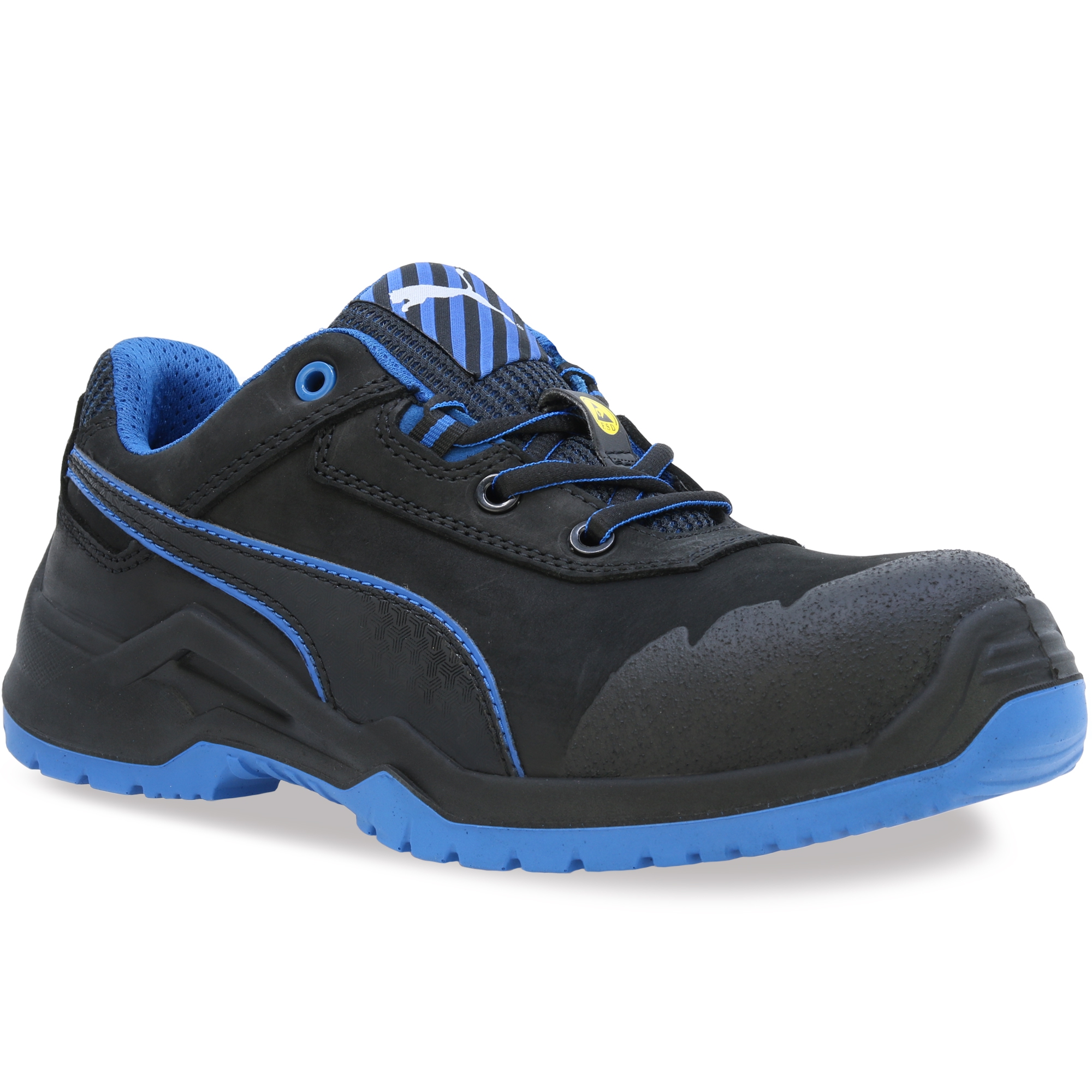 The metal free ARGON BLUE LOW of the TECHNICS LINE Linie by PUMA SAFETY is characterized by high flexibility and noticeable light construction. This is achieved by the naturalFLEXMOTION® sole architecture. It combines the "Natural Running" concept with the newest safety shoe technology.The S3 safety shoe with ESD characteristics of oiled nubuck leather is equipped with a highly-durable fiberglass cap and a FAP® anti-perforation protection. The inserted evercushion® BA footbed made of foam with open pores takes liquid away from the foot and provides together with the breathable BreathActive functional lining a comfortable foot climate during the whole day. The especially developed wafer profil guarantees hereby the best possible grip, in particular on smooth industry floors.