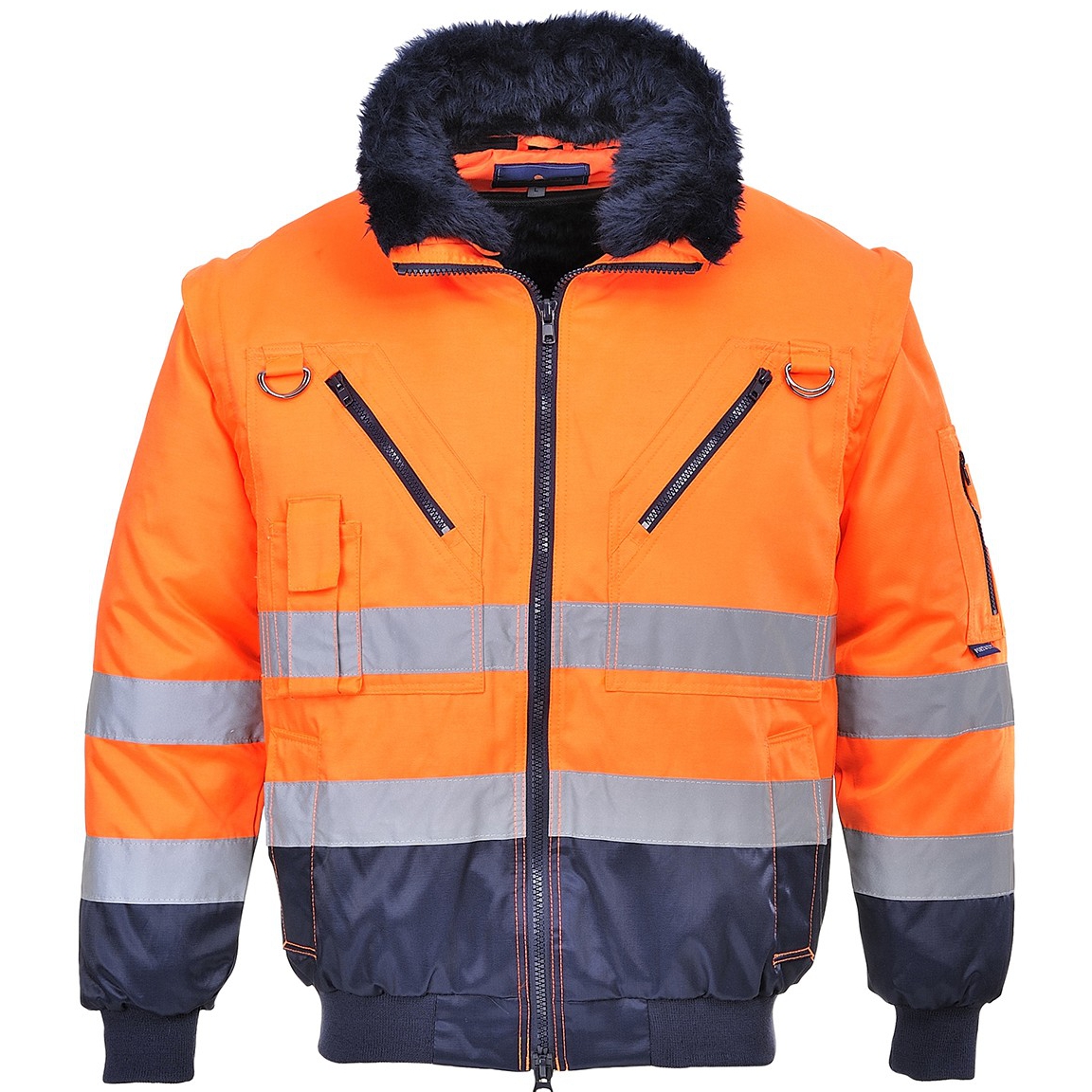 PJ50 3-1 Pilot bunda poskytuje univerzální a pohodlnou ochranu, tato bunda je vhodná pro nejrůznější pracovní prostředí. Kvalitní tkanina vynikající zpracování a bezkonkurenční funkce jsou standardní. Odnímatelná podšívka z kožešiny a límec v kombinaci s rukávy na zip jsou důkazem, že se jedná o velmi přizpůsobivý oděv. Četné vnější a vnitřní kapsy na zip poskytují vynikající osobní bezpečnost. Zip out bez rukávů kožešinové podšívky a odnímatelný límec lemovaný kožešinou pro přizpůsobivé teplo. Látka: 55% bavlna, 45% polyesterová keprová vazba 240g s vodoodpudivou úpravou. EN ISO 20471 Třída 3
