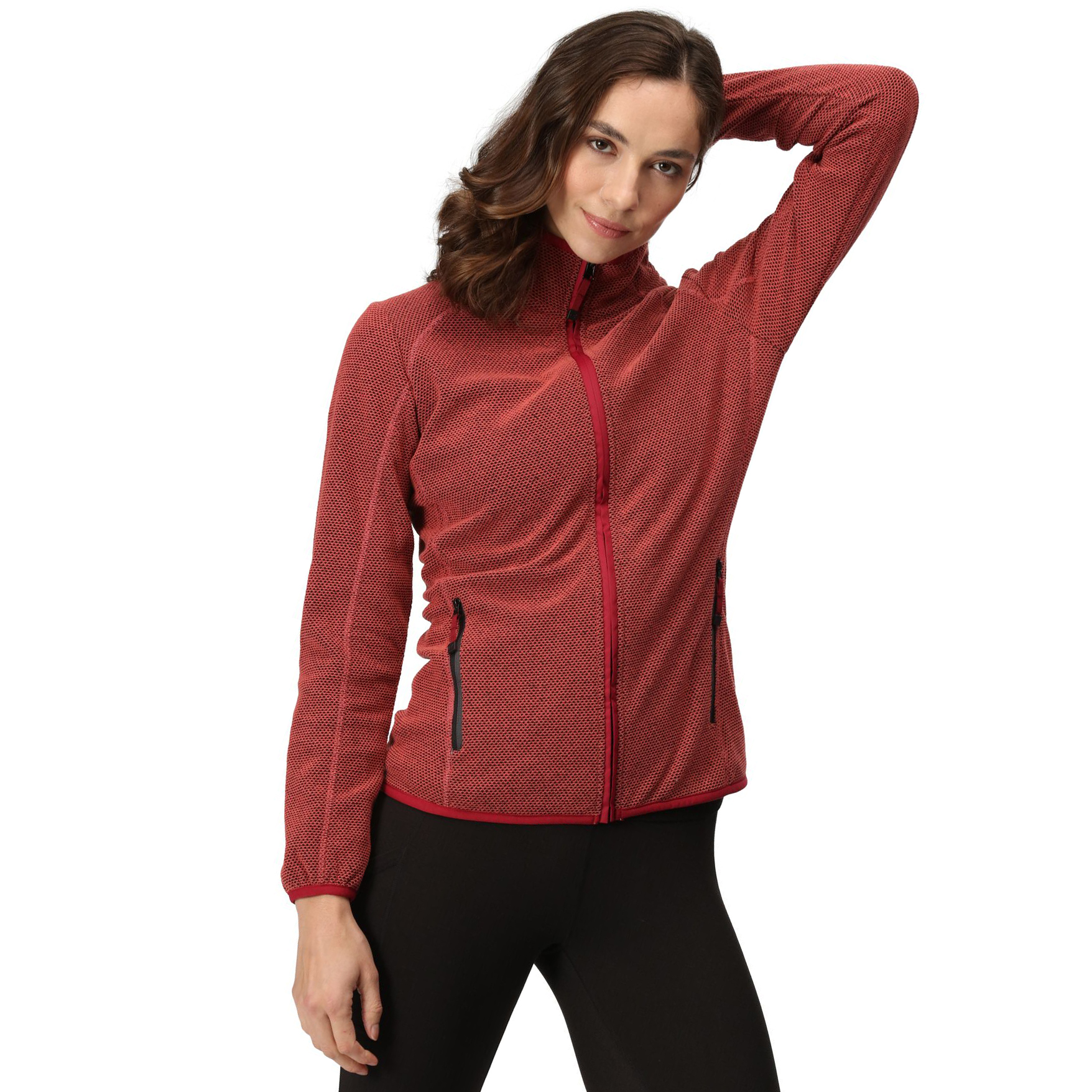 Dámská funkční mikina Kinwood, dámská fleece mikina s kapucí, celopropínací zip - dvě boční kapsy na zip - pružná lemovka na ukončení rukávů a spodního okraje - povrch s efektem peteniny obsahující dva tóny barev - kombinují se barva světle šedá s tmavo šedou v pravidelné struktuře.