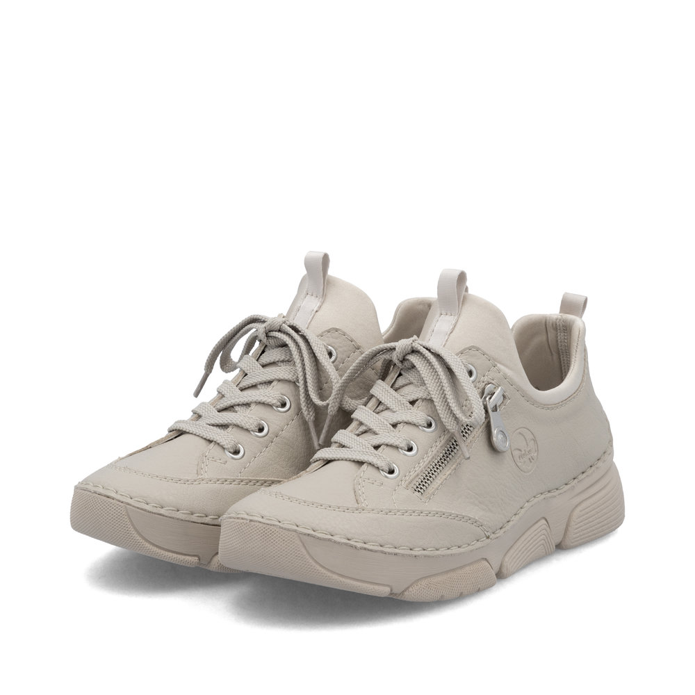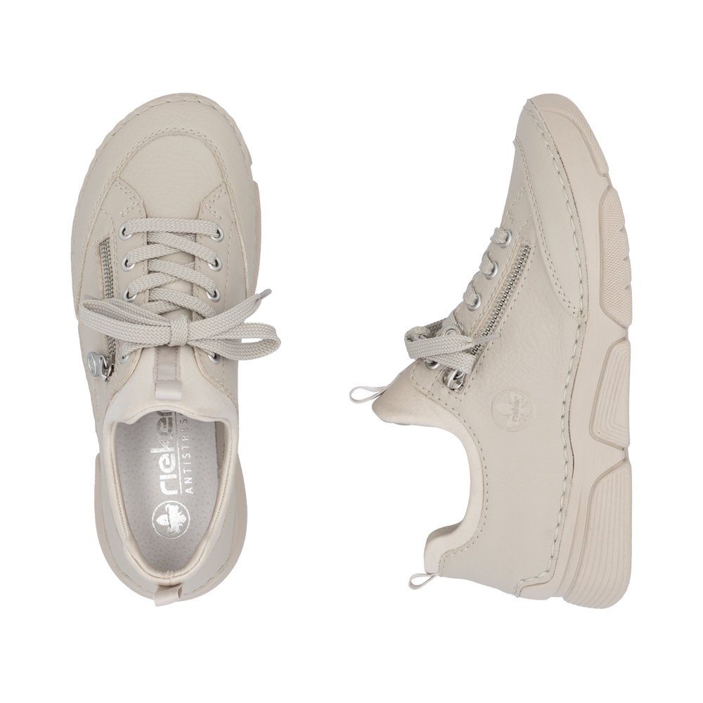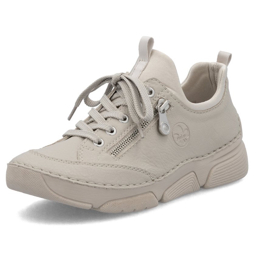 Tyto tenisky RIEKER jsou ideálním spojením originality, stylu a pohodlí. Béžové barevné provedení v kombinaci s vyraženým logem značky a ozdobným zipem dodává obuvi jedinečný a moderní vzhled. Díky pružnému hornímu okraji se tenisky snadno nazouvají, a šněrování zde slouží především jako elegantní designový prvek. Měkká kožená stélka poskytuje komfort i při celodenním nošení, ať už se chystáte do práce, na procházku nebo na běžné pochůzky po městě. Díky svému univerzálnímu vzhledu se snadno kombinují s různými outfity a stanou se oblíbenou součástí vašeho šatníku. O pohodlí při každém kroku se navíc postará technologie Antistress, která tlumí nárazy, snižuje hmotnost, zvyšuje flexibilitu a vytváří prostor pro pohodlnější pohyb.