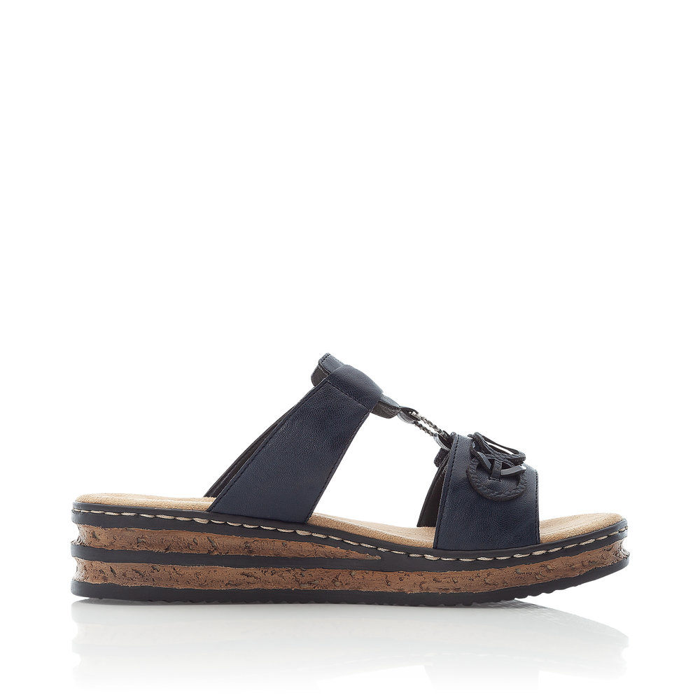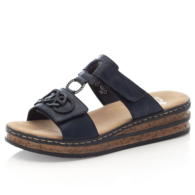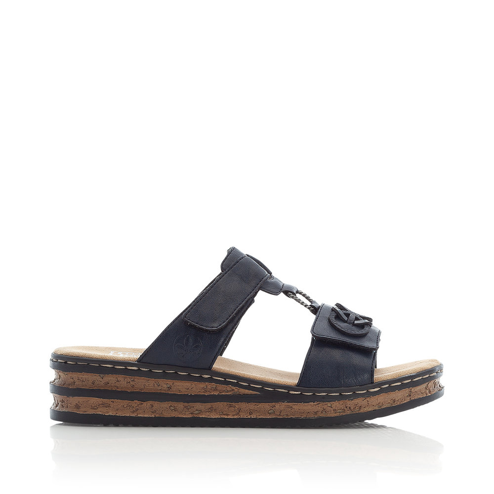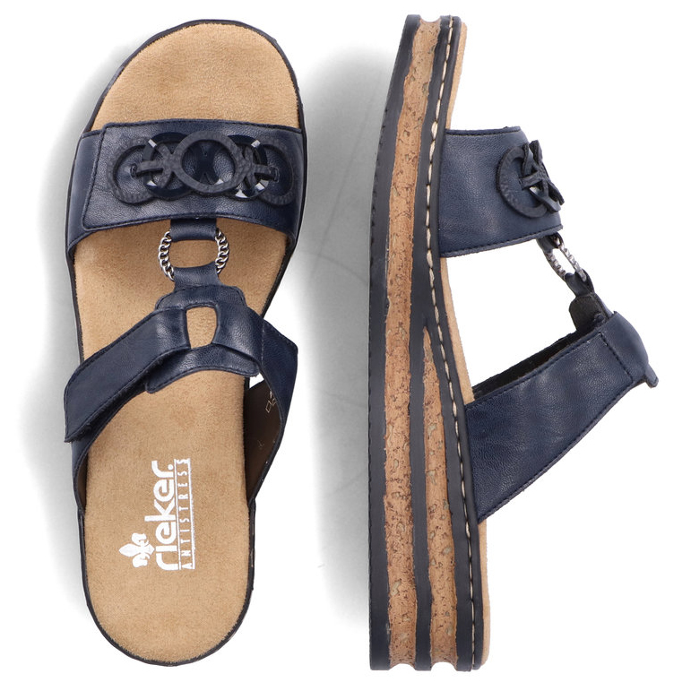 Tento dámský nazouvák značky RIEKER ocení každá žena, která má ráda jednoduchou eleganci. Tmavě modrý svršek je na předním pásku ozdoben aplikací v podobě spletených kruhů, zatímco kovový prvek spojuje přední a nártovou část a dodává botě sofistikovaný vzhled. Oba pásky jsou opatřeny suchým zipem, což umožňuje snadné nastavení podle individuálních potřeb. Měkká stélka je vyrobena z příjemného materiálu, který poskytuje maximální pohodlí při každém kroku. Stylová podešev s korkovým detailem a černými pruhy dotváří celkový vzhled sandálů k dokonalosti. Tyto nazouváky se skvěle hodí k dlouhým sukním i šatům, ať už na běžné nošení nebo speciální příležitosti.