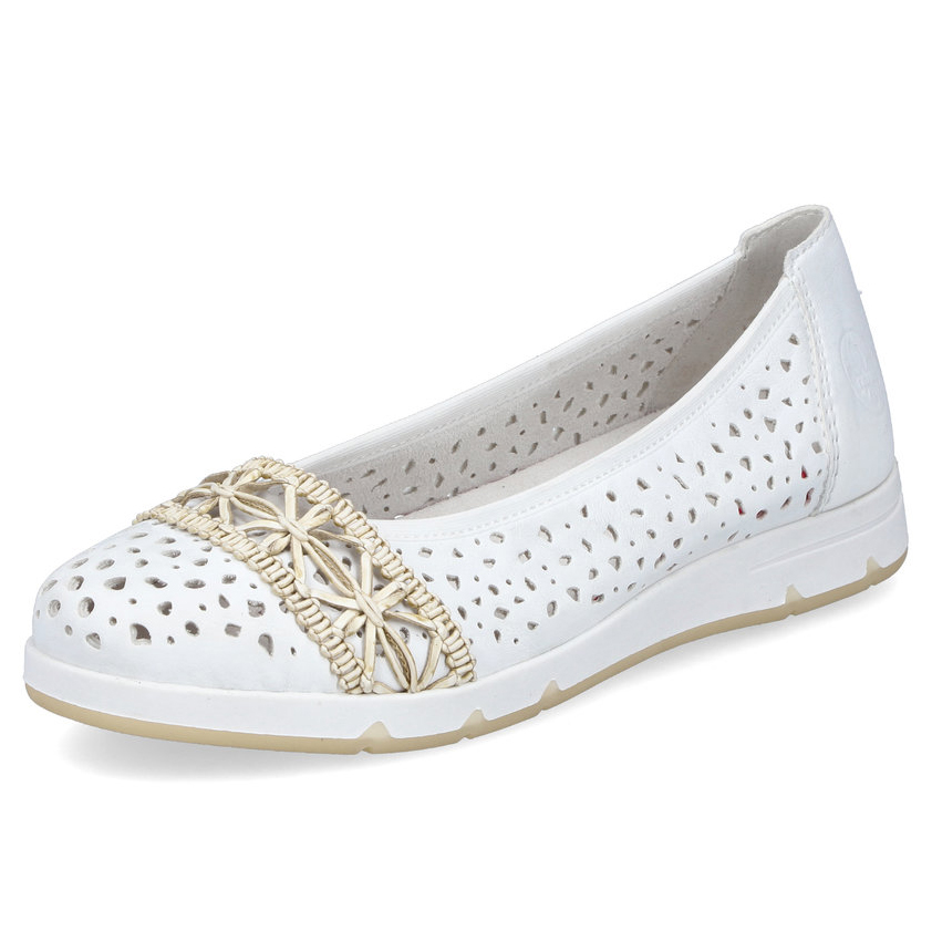 Elegantní a pohodlné baleríny RIEKER se stanou nepostradatelným doplňkem vašeho letního šatníku. Jejich bílý svršek je zdoben jemnou perforací, která nejen zajišťuje optimální prodyšnost, ale také dodává obuvi sofistikovaný vzhled. Přední část balerín je originálně zdobená, čímž podtrhuje jejich jedinečný styl. Měkká vyjímatelná stélka umožňuje individuální přizpůsobení a usnadňuje údržbu, zatímco flexibilní podešev se postará o pohodlný a přirozený pohyb při každém kroku. Díky inovativním technologiím, jako je Antistress a Rieker Soft, tyto baleríny nejen skvěle vypadají, ale zároveň poskytují maximální komfort po celý den. Ideální volba pro ženy, které chtějí spojit styl, lehkost a pohodlí.