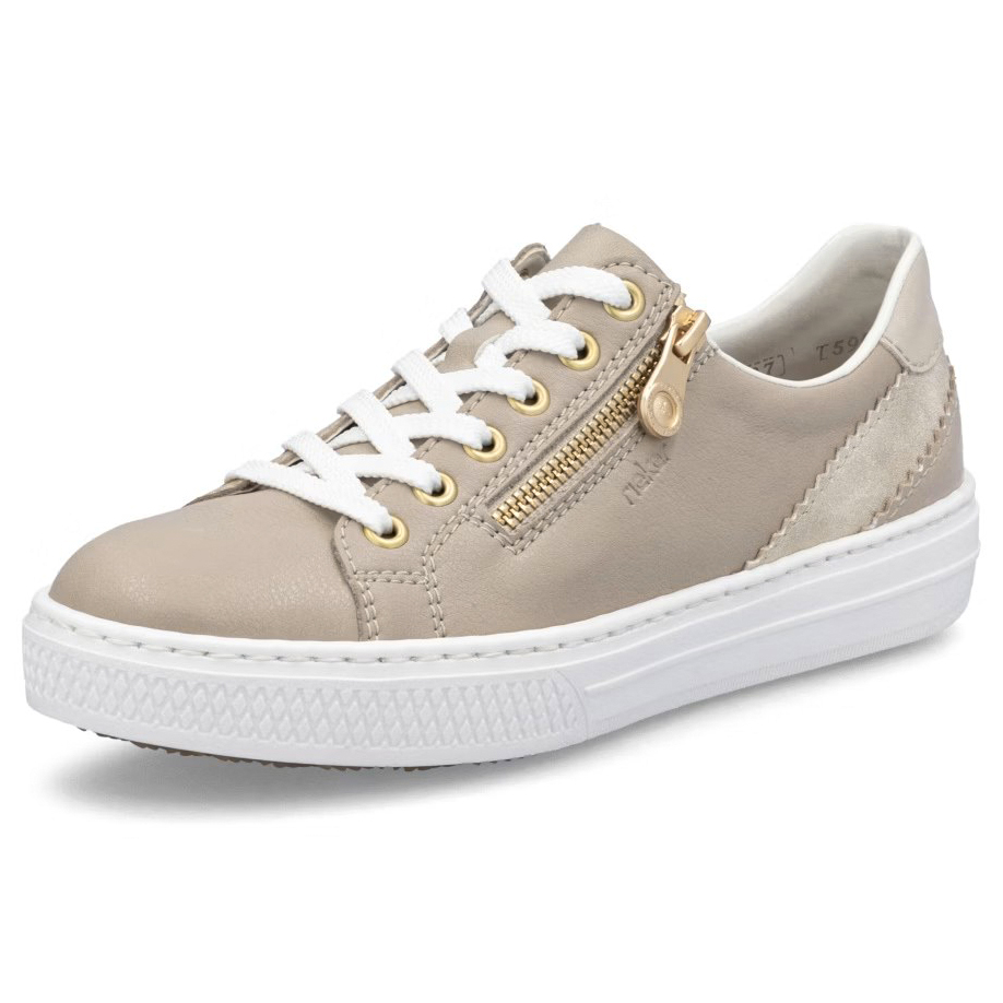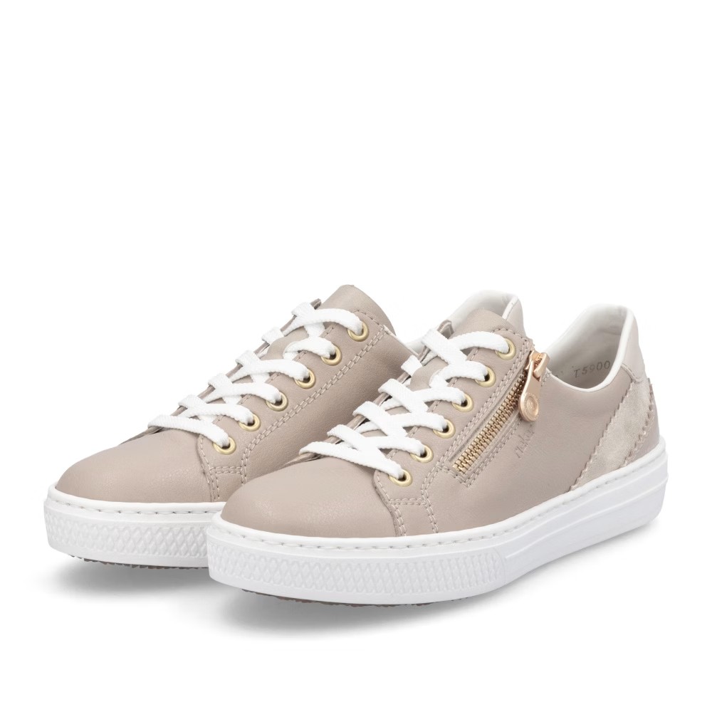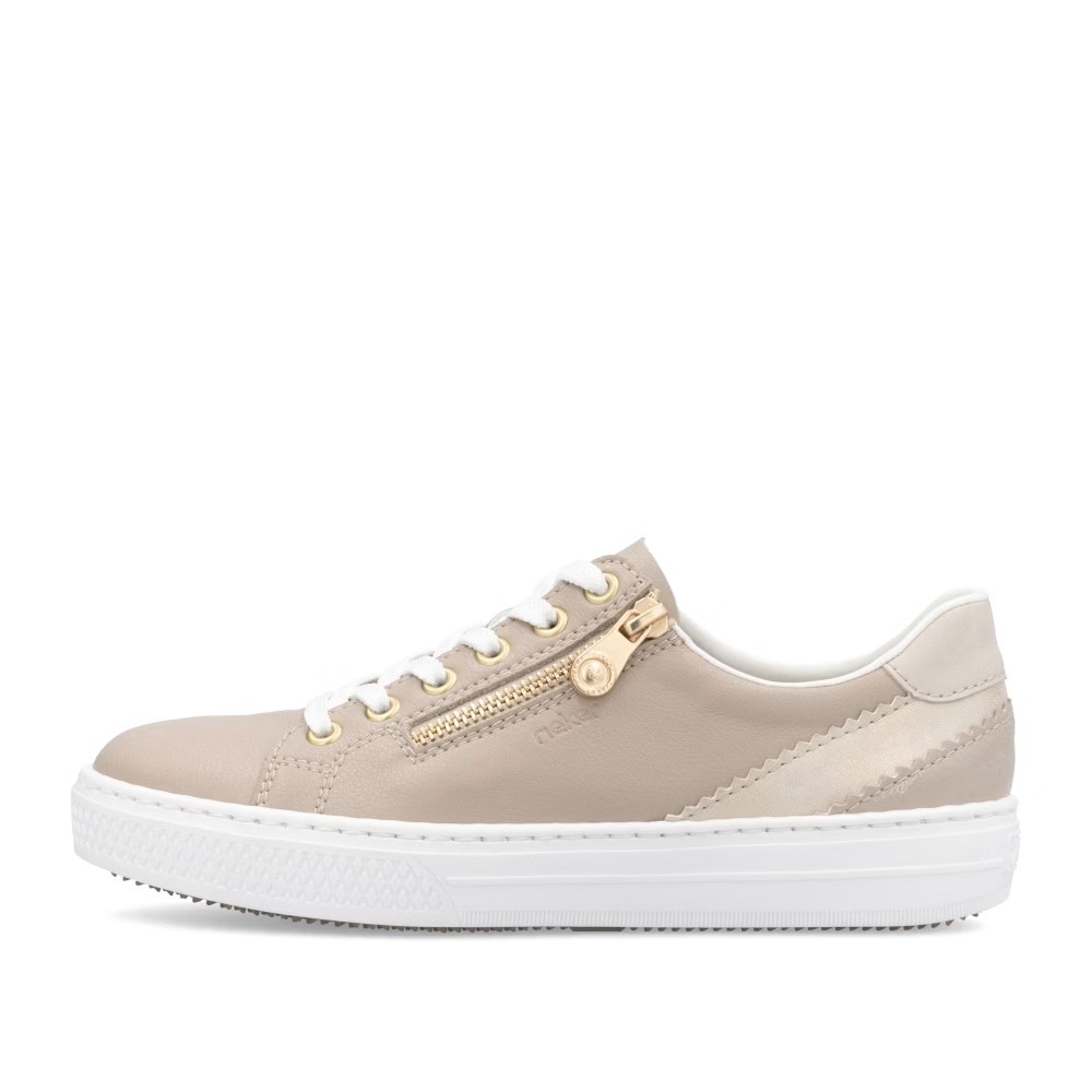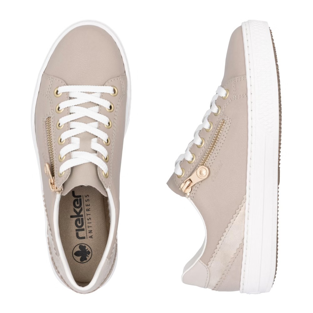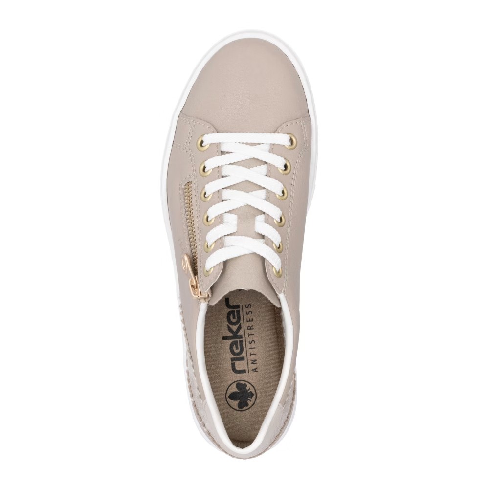 Stylové tenisky RIEKER v elegantním béžovém odstínu jsou dokonalým módním doplňkem pro každou ženu, která hledá spojení moderního vzhledu a maximálního pohodlí. Metalický prvek v oblasti paty dodává obuvi nádech luxusu, zatímco decentní logo značky RIEKER podtrhuje vysokou kvalitu provedení. Praktické nazouvání usnadňuje zip umístěný na nártu, zatímco šněrování zajistí individuální přizpůsobení a pevné držení chodidla. Stabilní podešev poskytuje potřebnou oporu při chůzi a zajišťuje bezpečnost na různých typech povrchů. O váš celodenní komfort se postará inovativní stélka MemoSoft z paměťové pěny, která se dokonale přizpůsobí tvaru nohy a poskytne měkký došlap. Tyto tenisky jsou ideální volbou pro každodenní nošení, ať už do práce, na procházku nebo na volnočasové aktivity. Technologie: Antistress – inovativní podešev s lehkým, pružným a prostorným designem, která absorbuje nárazy a zajišťuje pohodlnou chůzi. MemoSoft – speciální stélka z paměťové pěny, která změkčuje došlap a přizpůsobuje se tvaru chodidla.