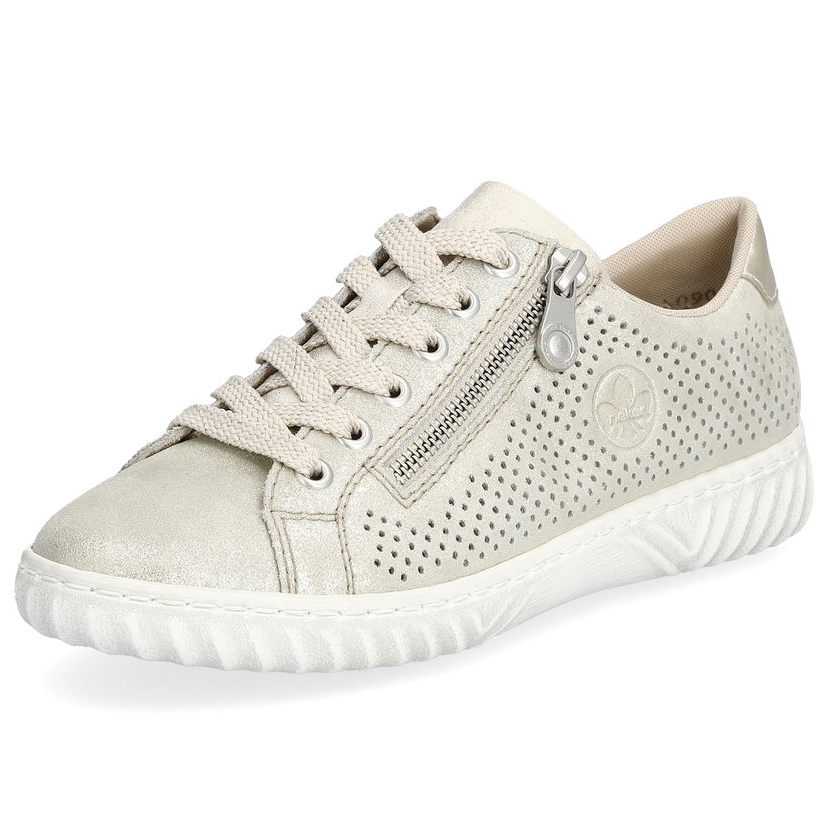 Tyto stylové městské tenisky značky RIEKER okamžitě upoutají pozornost díky jemné perforaci a kulatému logu značky, které dodávají obuvi moderní a svěží vzhled. Kombinace klasického šněrování a praktického funkčního zipu na vnější straně umožňuje snadné nazouvání i dokonalé přizpůsobení chodidlu. Bílá podešev s technologií Antistress je nejen lehká a flexibilní, ale také skvěle tlumí nárazy při chůzi, což zajišťuje výjimečné pohodlí po celý den. Měkká stélka se postará o komfort na každém kroku, ať už vyrazíte na procházku po městě, do práce nebo na víkendový výlet. Tyto tenisky jsou perfektní volbou pro ženy, které hledají stylovou a pohodlnou obuv vhodnou pro každodenní nošení.