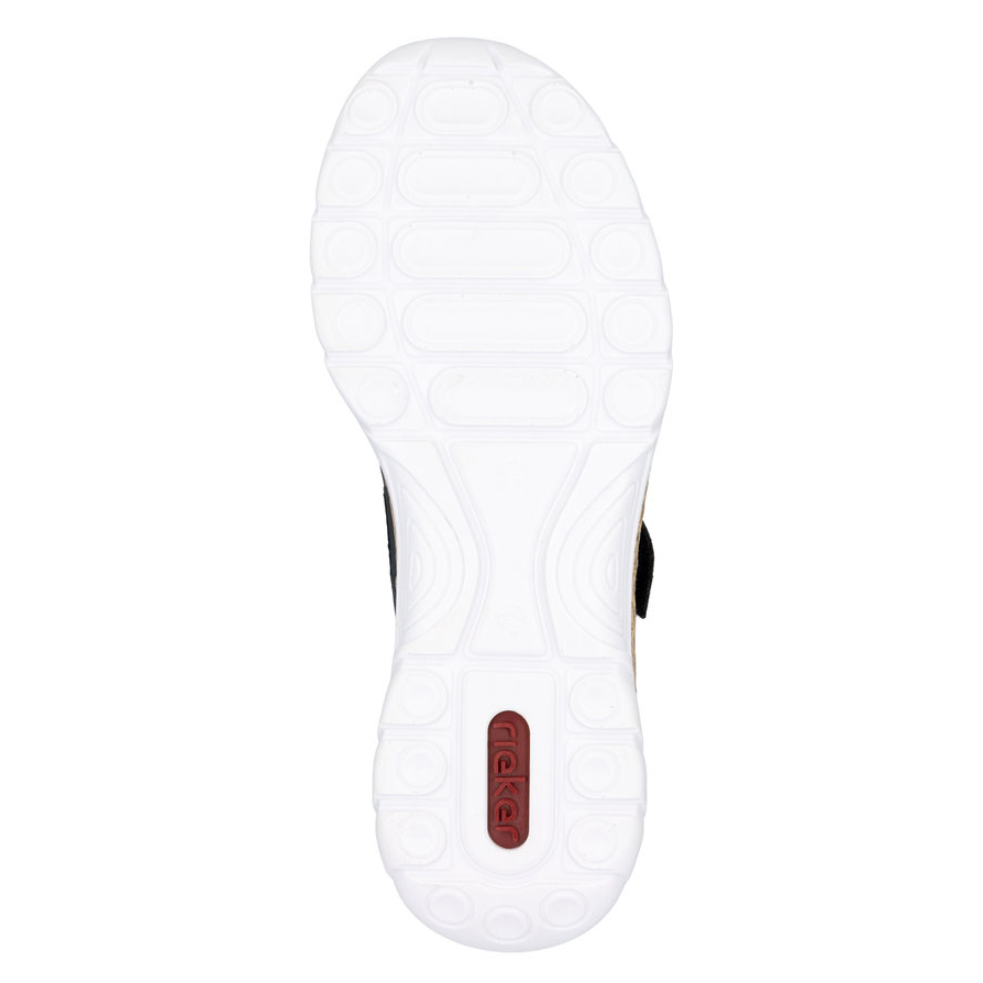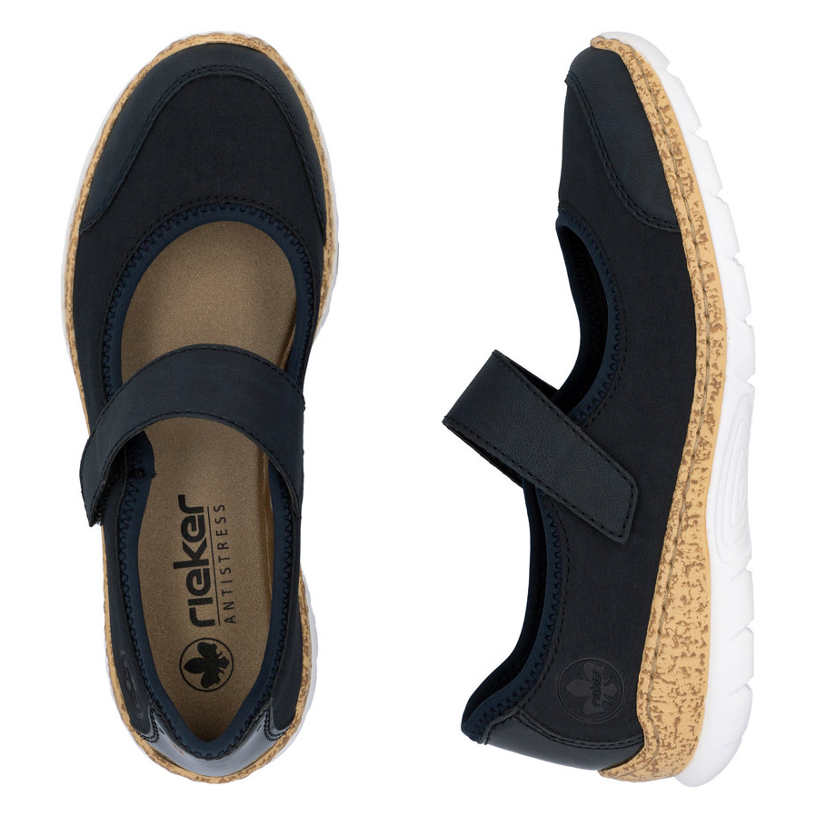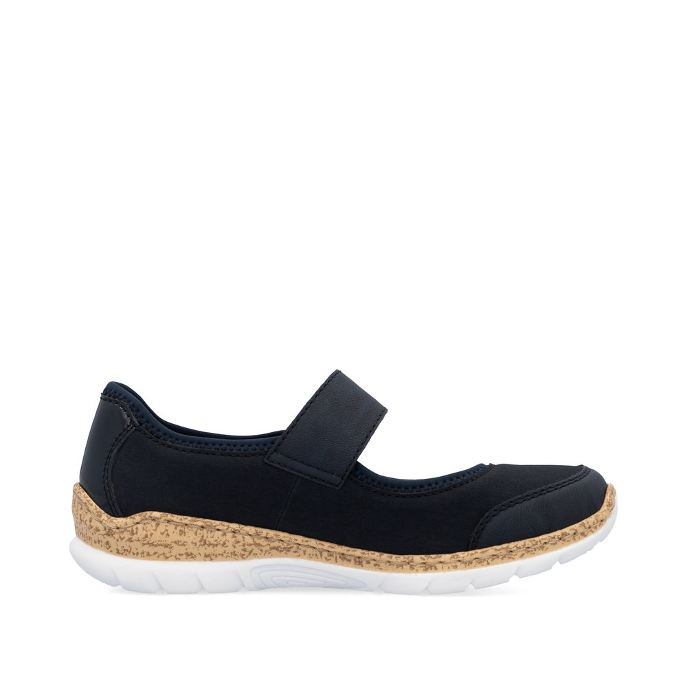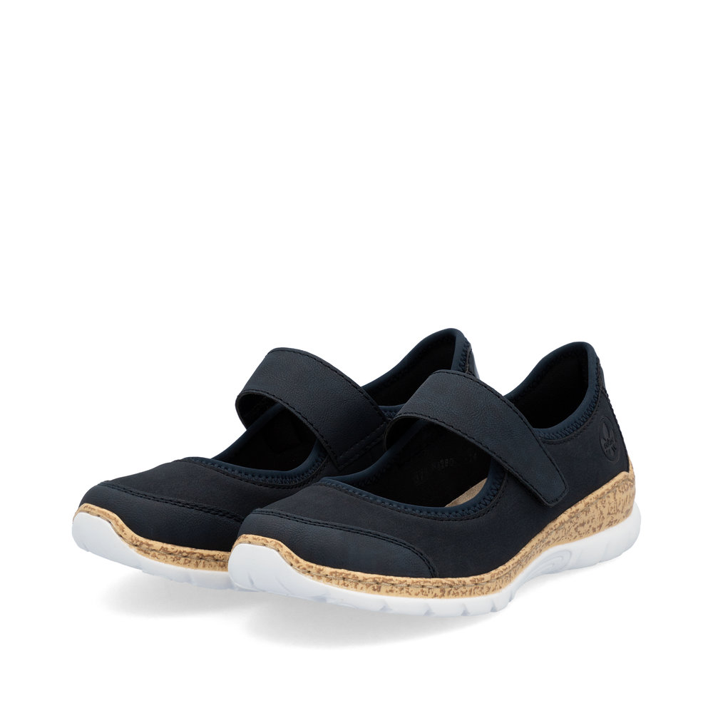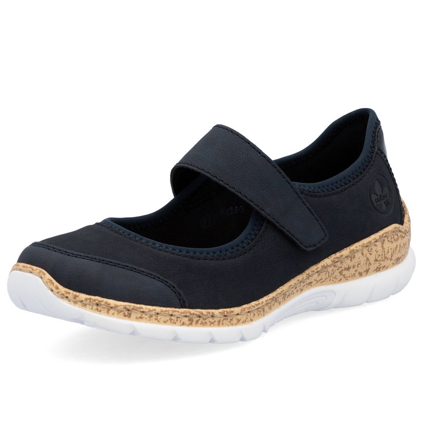 Dopřejte svým nohám maximální pohodlí s elegantními balerínami RIEKER, které spojují styl a funkčnost. Tmavě modrý svršek zaujme nejen svou decentní elegancí, ale i lesklým detailem v oblasti paty a jemným logem značky, které podtrhují sofistikovaný vzhled obuvi. Praktický pásek přes nárt se zapínáním na suchý zip umožňuje snadné nazutí a přizpůsobení přesně podle vašich potřeb. Měkká stélka zajistí komfort i při celodenním nošení, zatímco podešev s atraktivním designem efektivně tlumí nárazy a poskytuje stabilitu. Tyto baleríny jsou skvělou volbou pro ženy, které hledají stylovou, pohodlnou a praktickou obuv pro každodenní nošení.