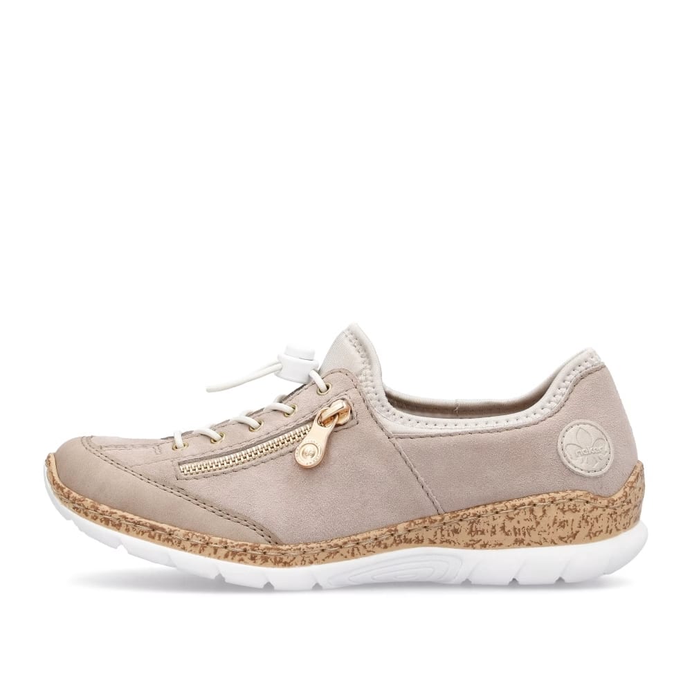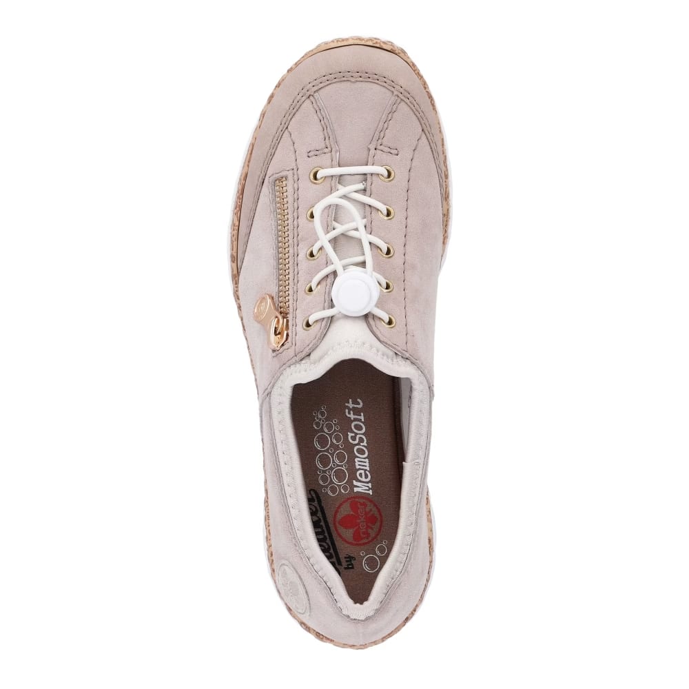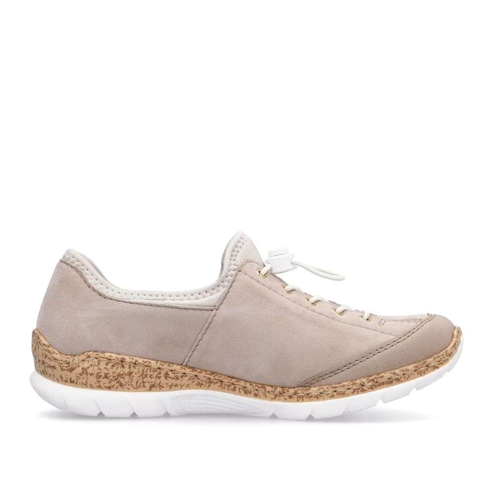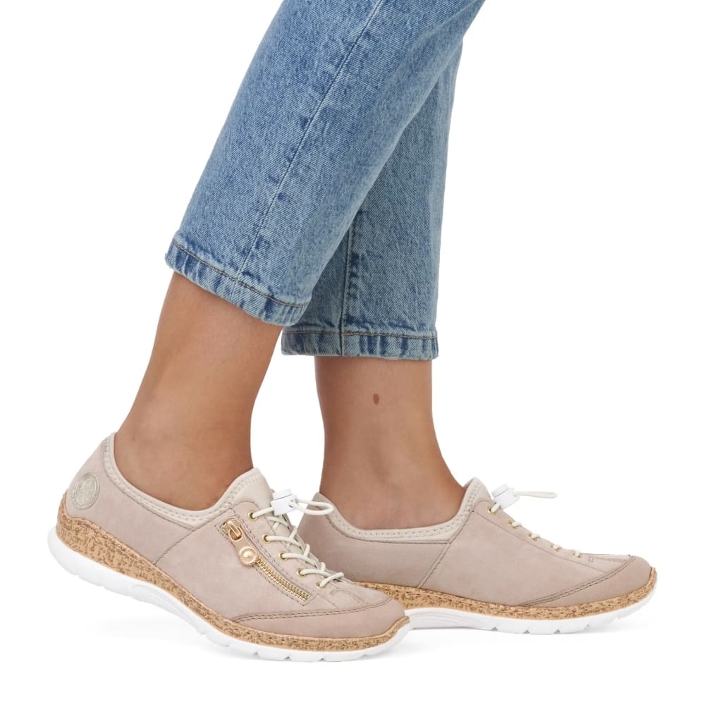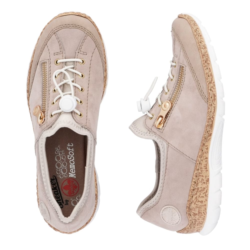 Tyto dámské tenisky RIEKER jsou výjimečné díky přírodnímu semišovému materiálu. Elegantní design doplňuje logo značky, dekorativní zip a lemovaná podešev z imitace korku, která okamžitě upoutá pozornost. Snadné obouvání zajišťuje šněrování s pružnými gumičkami, které lze jemně utáhnout podle potřeby. Pokud hledáte stylovou a pohodlnou obuv, tento model je pro vás tou správnou volbou. Technologie: Antistress: Lehká a flexibilní podešev, která absorbuje nárazy a přizpůsobuje se tvaru nohy pro maximální pohodlí. MemoSoft: Stélka z paměťové pěny, která změkčuje došlap a přizpůsobuje se tvaru chodidla.