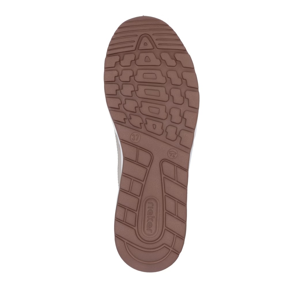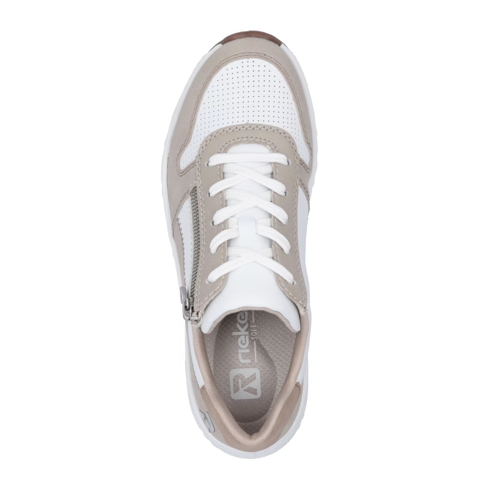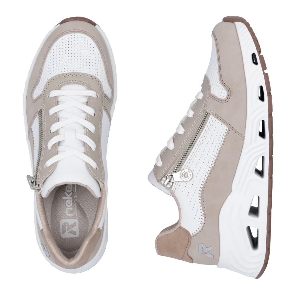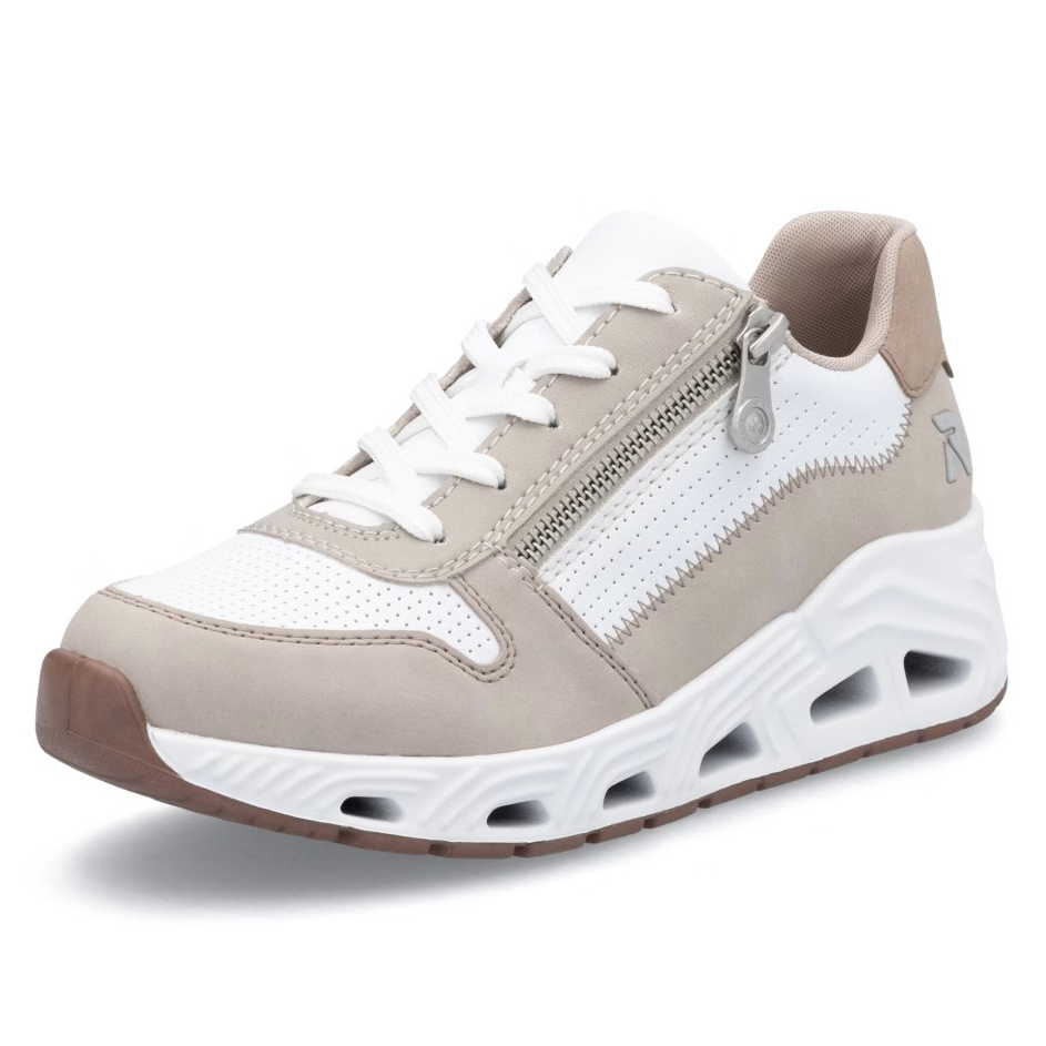 Super stylové, super in! To jsou tenisky RIEKER, které se stanou nepostradatelnou součástí vašeho šatníku. Světlý svršek je elegantně doplněn o bílé části a jemné prošívání, které dotváří jejich dokonalý vzhled. Funkční zip v kombinaci se šněrováním umožňuje snadné obouvání a přizpůsobení tvaru nohy. Unikátní lehká podrážka zajišťuje pohodlný došlap, zatímco vyjímatelná měkká stélka RiekerSoft poskytuje maximální komfort při každém kroku. Tyto stylové tenisky jsou ideální volbou pro každodenní nošení, ať už do města, na procházky nebo volnočasové aktivity. Kombinace moderního designu a inovativních technologií z nich dělá dokonalou obuv pro váš aktivní životní styl.