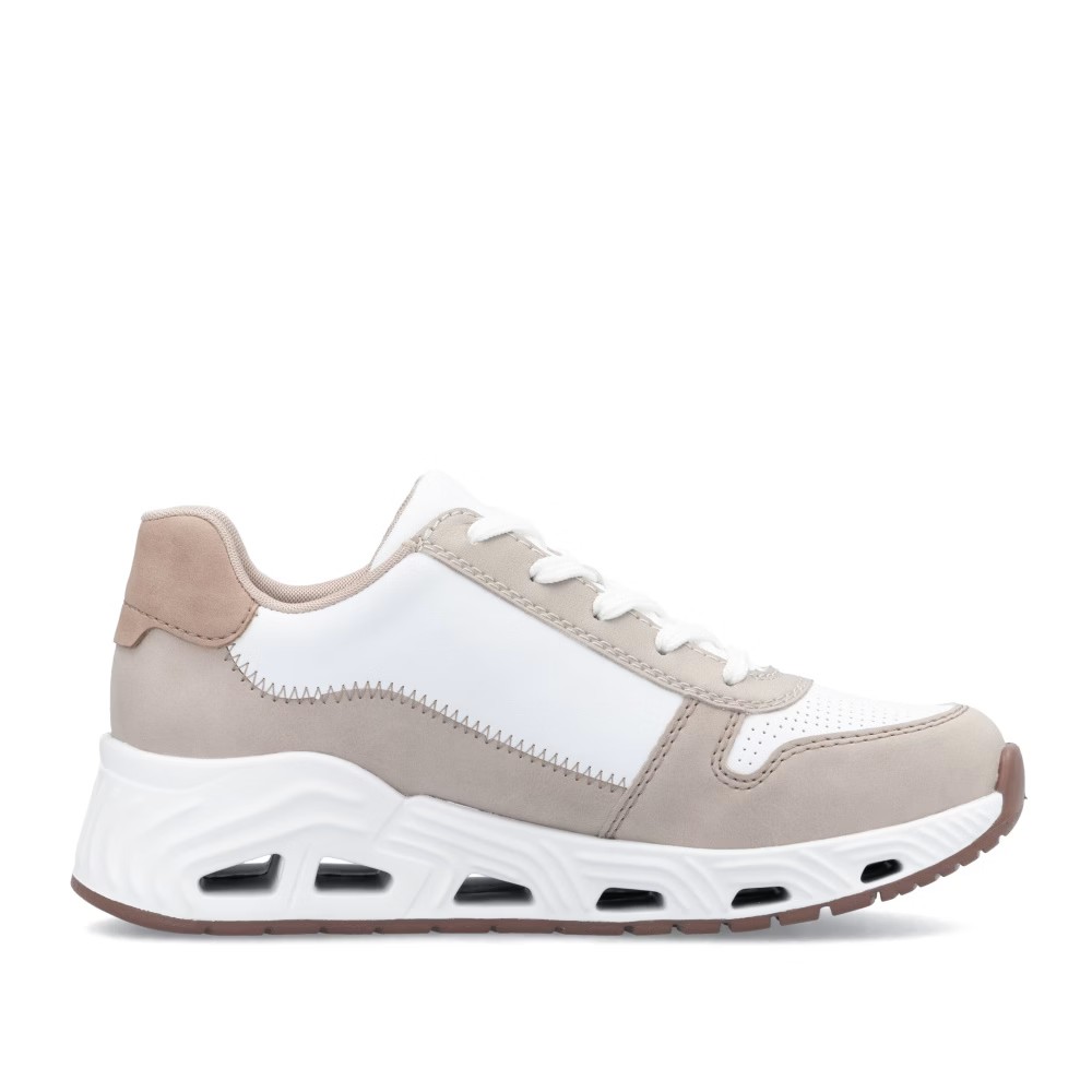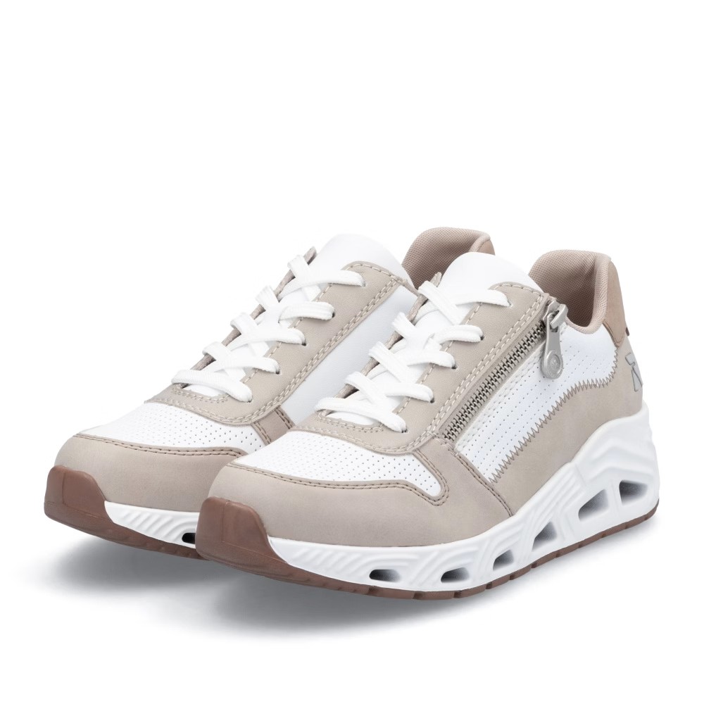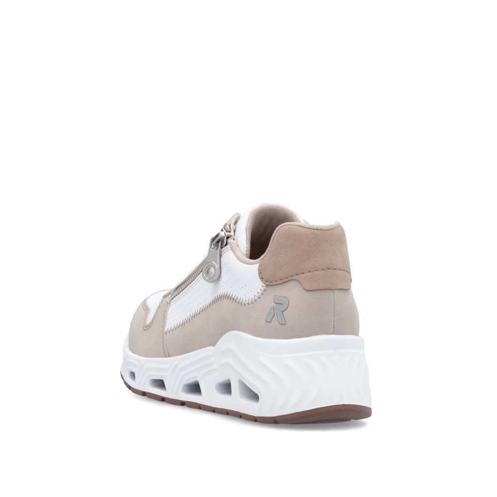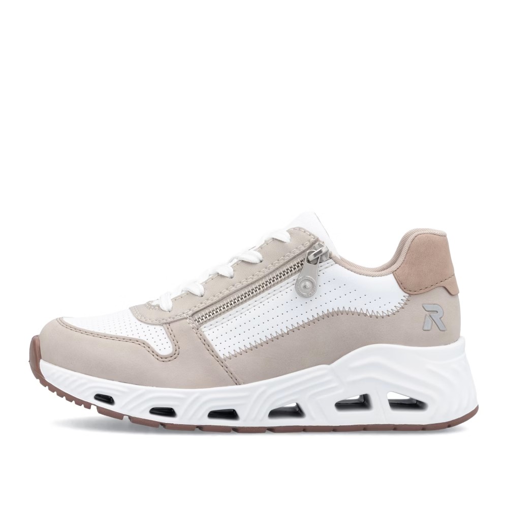 Super stylové, super in! To jsou tenisky RIEKER, které se stanou nepostradatelnou součástí vašeho šatníku. Světlý svršek je elegantně doplněn o bílé části a jemné prošívání, které dotváří jejich dokonalý vzhled. Funkční zip v kombinaci se šněrováním umožňuje snadné obouvání a přizpůsobení tvaru nohy. Unikátní lehká podrážka zajišťuje pohodlný došlap, zatímco vyjímatelná měkká stélka RiekerSoft poskytuje maximální komfort při každém kroku. Tyto stylové tenisky jsou ideální volbou pro každodenní nošení, ať už do města, na procházky nebo volnočasové aktivity. Kombinace moderního designu a inovativních technologií z nich dělá dokonalou obuv pro váš aktivní životní styl.
