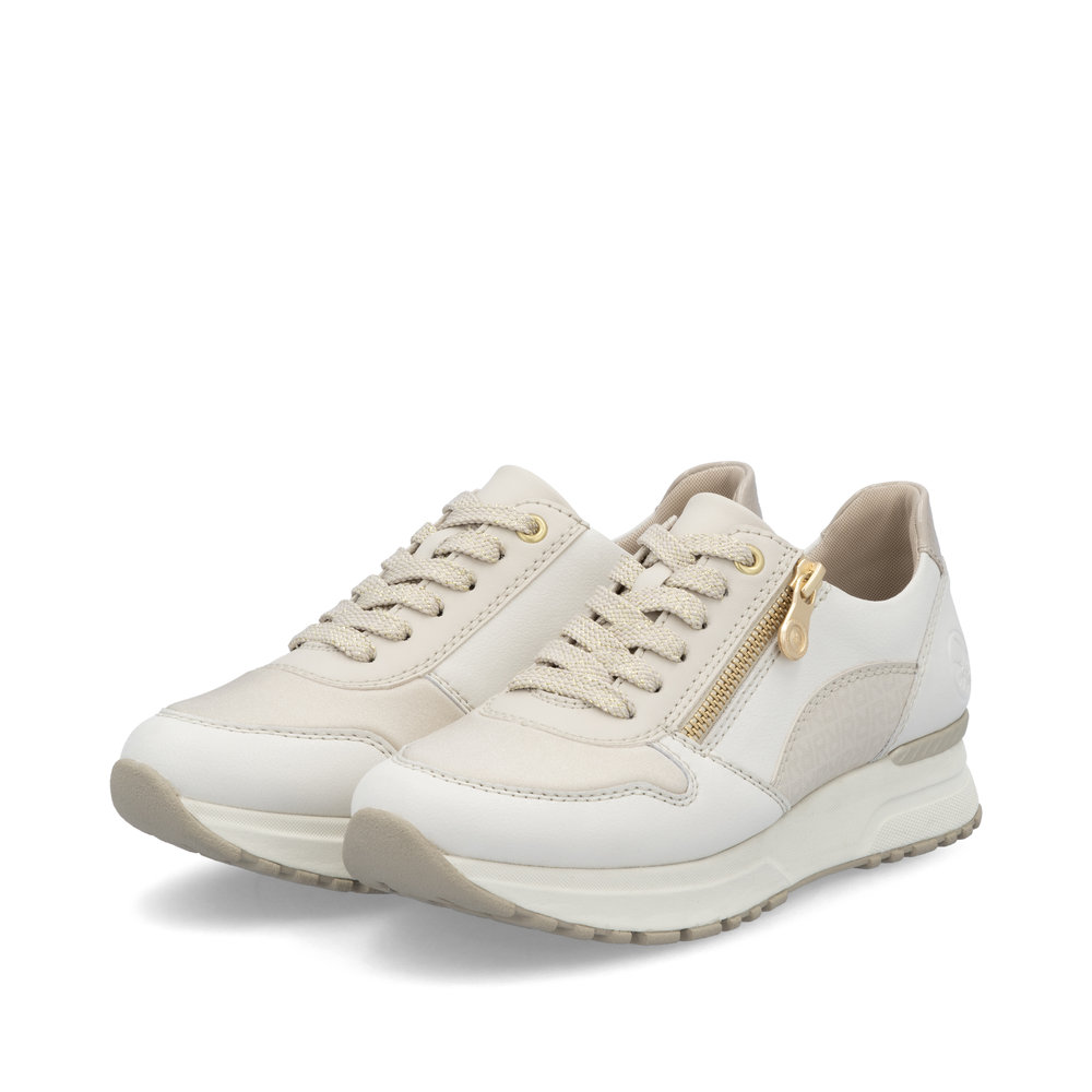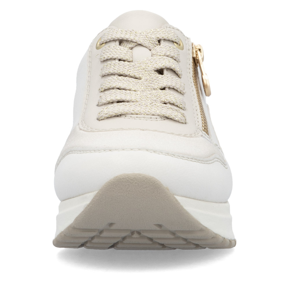 Půvabné tenisky RIEKER dokonale propojují eleganci s pohodlím a přinášejí stylový doplněk pro každodenní nošení. Béžový svršek s jemnými zlatavými odlesky dodává obuvi luxusní vzhled a podtrhuje její jedinečný charakter. Kombinace šněrování na nártu a praktického bočního zipu umožňuje snadné obouvání i dokonalé přizpůsobení tvaru nohy. Měkká vyjímatelná stélka poskytuje optimální oporu a komfort při každém kroku, zatímco flexibilní podešev s ozdobným prvkem na patě nejen vkusně doplňuje design, ale zároveň přispívá k pohodlnému a stabilnímu kroku. Tento stylový model je ideální volbou pro letní dny, kdy hledáte spojení elegance, komfortu a moderního vzhledu.