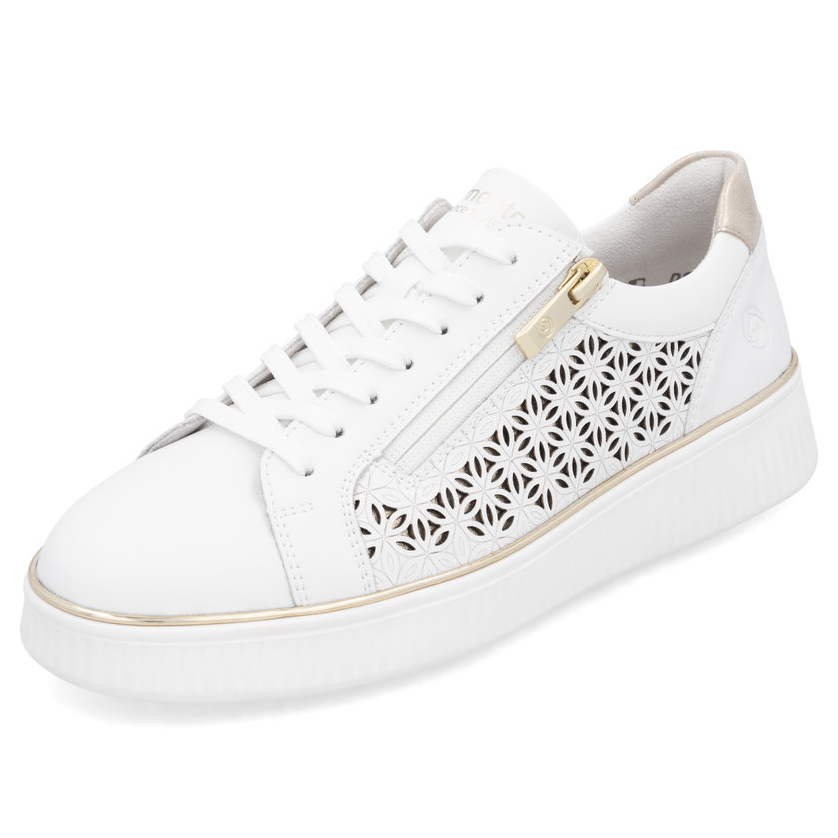 Obuv REMONTE představuje prémiovou řadu značky RIEKER a vyniká precizním zpracováním a kombinací kvalitních svrchních materiálů. Tyto bílé tenisky upoutají pozornost jemnou perforací a elegantními zlatavými akcenty, které dodávají botám sofistikovaný vzhled, zatímco metalický detail na patě podtrhuje jejich moderní design. Praktický zip na nártu umožňuje rychlé a pohodlné obutí, zatímco šněrování zajistí perfektní přizpůsobení noze. Vyjímatelná měkká stélka poskytuje celodenní komfort, a lehká kontrastní podešev nejen že dodává botám stylový vzhled, ale také zaručuje stabilitu při chůzi. Díky technologiím Remonte Soft a Lite'n Soft si užijete výjimečné pohodlí, které oceníte při každodenním nošení. Tento elegantní model je ideální volbou pro ženy, které hledají módní tenisky s důrazem na pohodlí a detail.