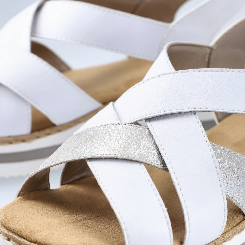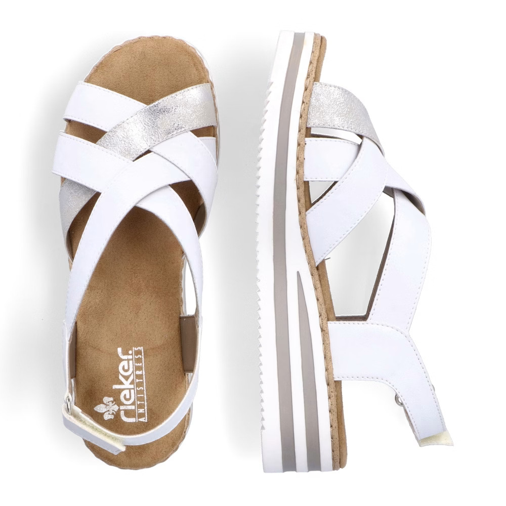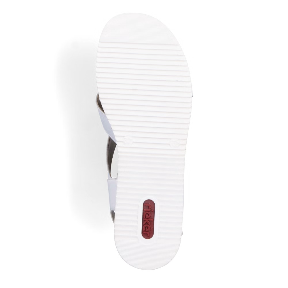 Stylové dámské sandálky značky RIEKER vylepší každý Váš outfit. Pásky jsou přes nárt stylově překříženy a zapínáním na suchý zip si obuv pohodlně přizpůsobíte dle svých požadavků. Měkká stélka je vyrobena z příjemného materiálu a podešev svým provedením a výškou dolaďuje celkový vzhled k dokonalosti. Tento model bude skvěle vypadat se sukněmi či dlouhými šaty.Technologie: Antistress – podešev je díky této technologii lehká, flexibilní, absorbuje nárazy při došlapu a snadno se přizpůsobí každé noze.