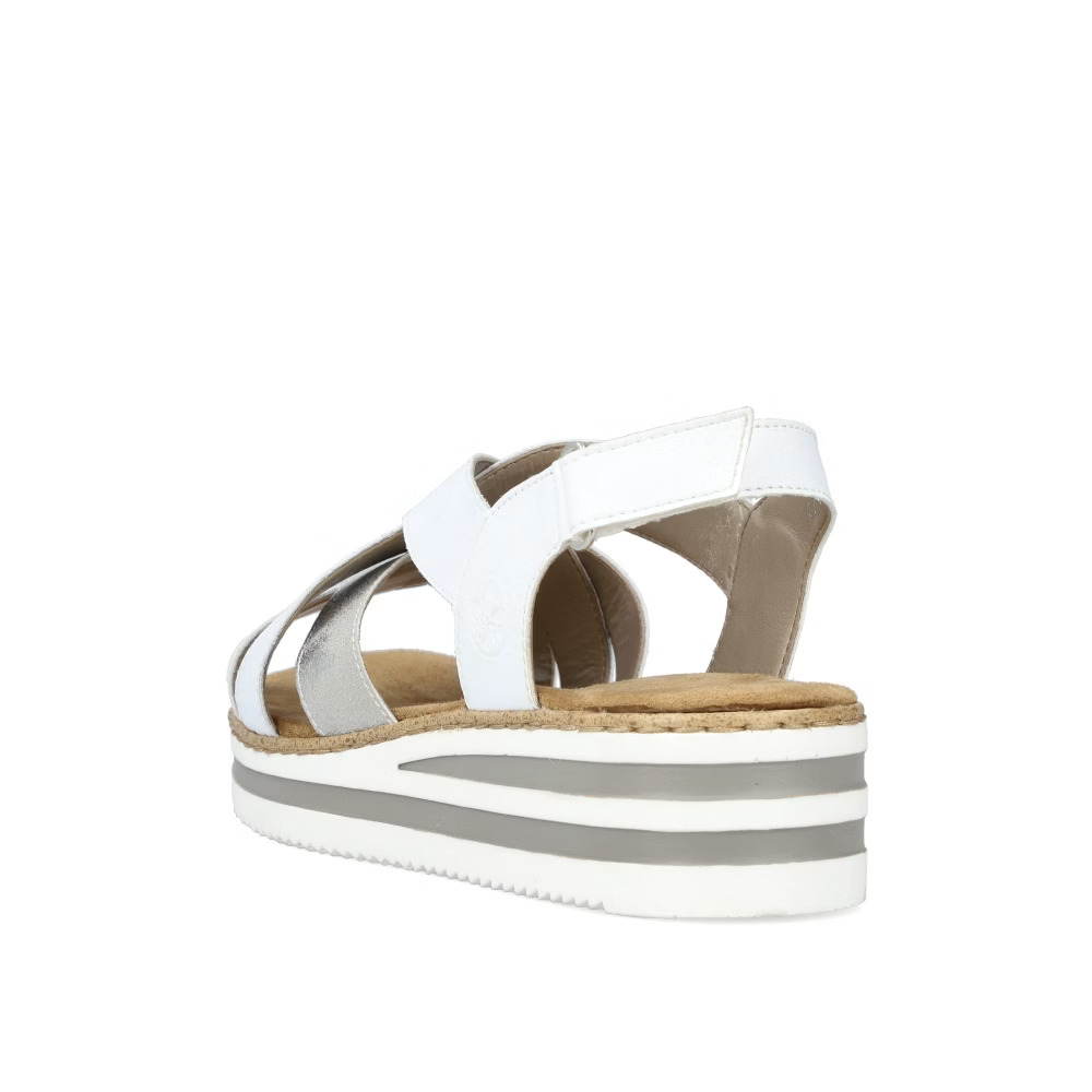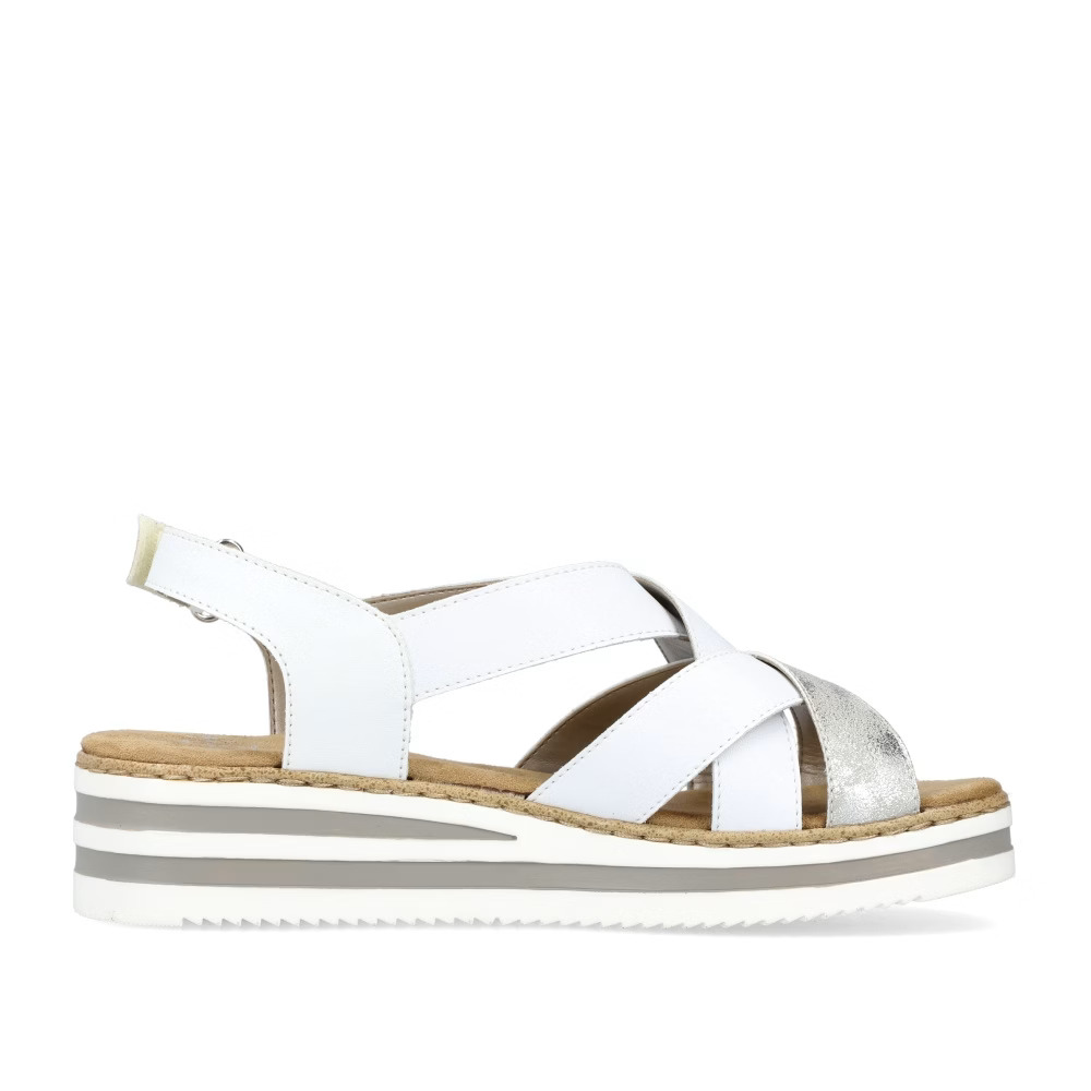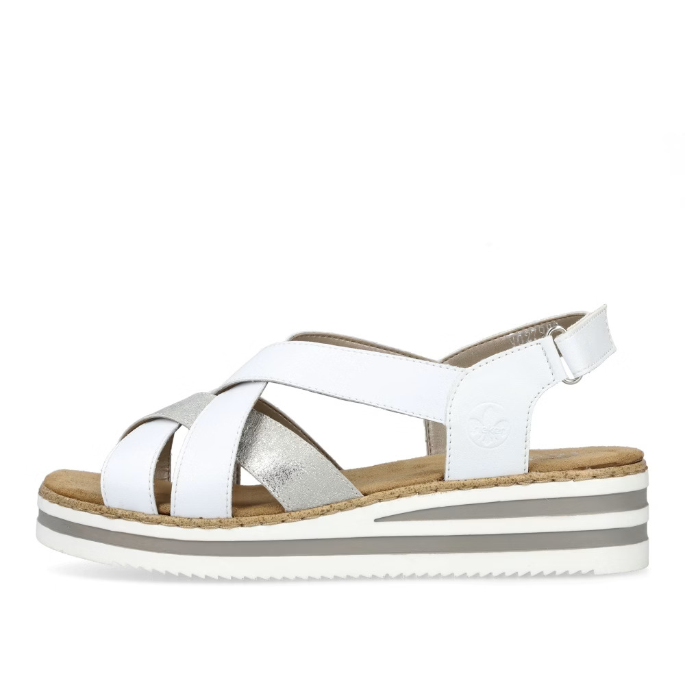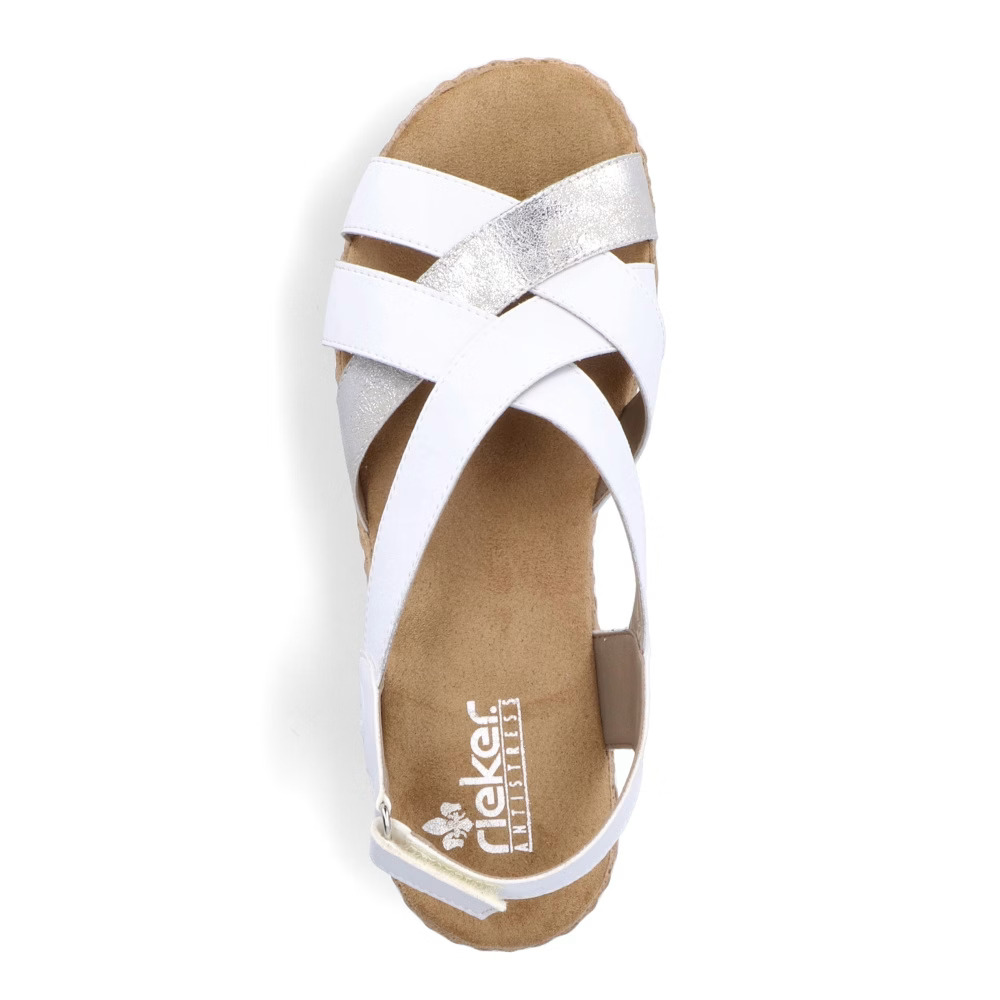 Stylové dámské sandálky značky RIEKER vylepší každý Váš outfit. Pásky jsou přes nárt stylově překříženy a zapínáním na suchý zip si obuv pohodlně přizpůsobíte dle svých požadavků. Měkká stélka je vyrobena z příjemného materiálu a podešev svým provedením a výškou dolaďuje celkový vzhled k dokonalosti. Tento model bude skvěle vypadat se sukněmi či dlouhými šaty.Technologie: Antistress – podešev je díky této technologii lehká, flexibilní, absorbuje nárazy při došlapu a snadno se přizpůsobí každé noze.