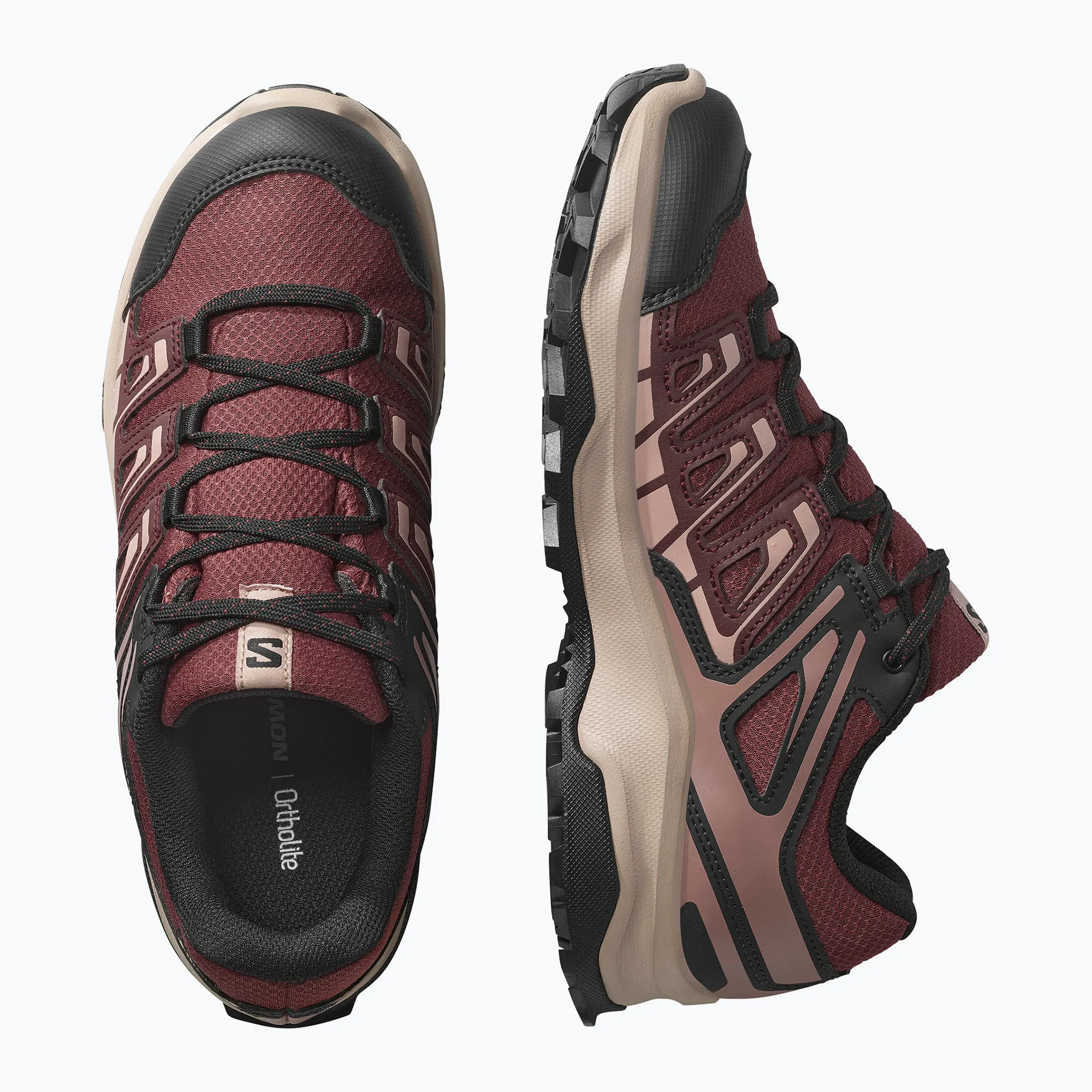 SALOMON Exterga GTX vínová dámská outdoorová obuv je určena pro ženy, které hledají spolehlivost, výkon a styl při pohybu v přírodě. Díky membráně Gore-Tex® je obuv plně voděodolná, přitom zůstává skvěle prodyšná, což zajišťuje suché a pohodlné nohy i při dlouhých výpravách v dešti nebo mokrém terénu. Podešev Contagrip® poskytuje výbornou přilnavost a stabilitu na různých površích – od kamenitých stezek až po měkký lesní podklad. Ergonomický střih, kvalitní materiály a odolná konstrukce garantují dlouhou životnost i pohodlné nošení. Elegantní vínová barva dodává botám moderní vzhled, který skvěle ladí s funkčností, a činí z tohoto modelu ideální volbu pro turistiku, treking i každodenní pobyt v přírodě.