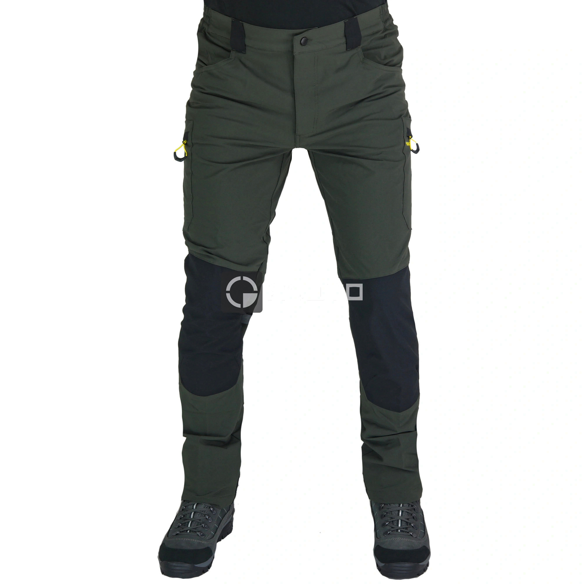 Kalhoty z bi-strečové látky 90 % polyester, 10 % spandex, kationtový strečový ripstop výztužný materiál 94 % polyester a 6 % spandex, 240 g/m2. Vodoodpudivá úprava. Vybaveno zapínáním na zip a cvoček, dvě přední kapsy, dvě našité kapsy, zapínání na krytý zip. Zadní kapsy uzavíratelné klopou a suchým zipem, elastické boční vsadky v pase, předtvarovaná kolena. Ergonomický střih zadní části kalhot, zesílení na kolenou, zesílená pata ve spodní části nohavic. Dvojité zesílené švy. Série 4-Way Stretch kombinuje lehkost a prodyšnost.