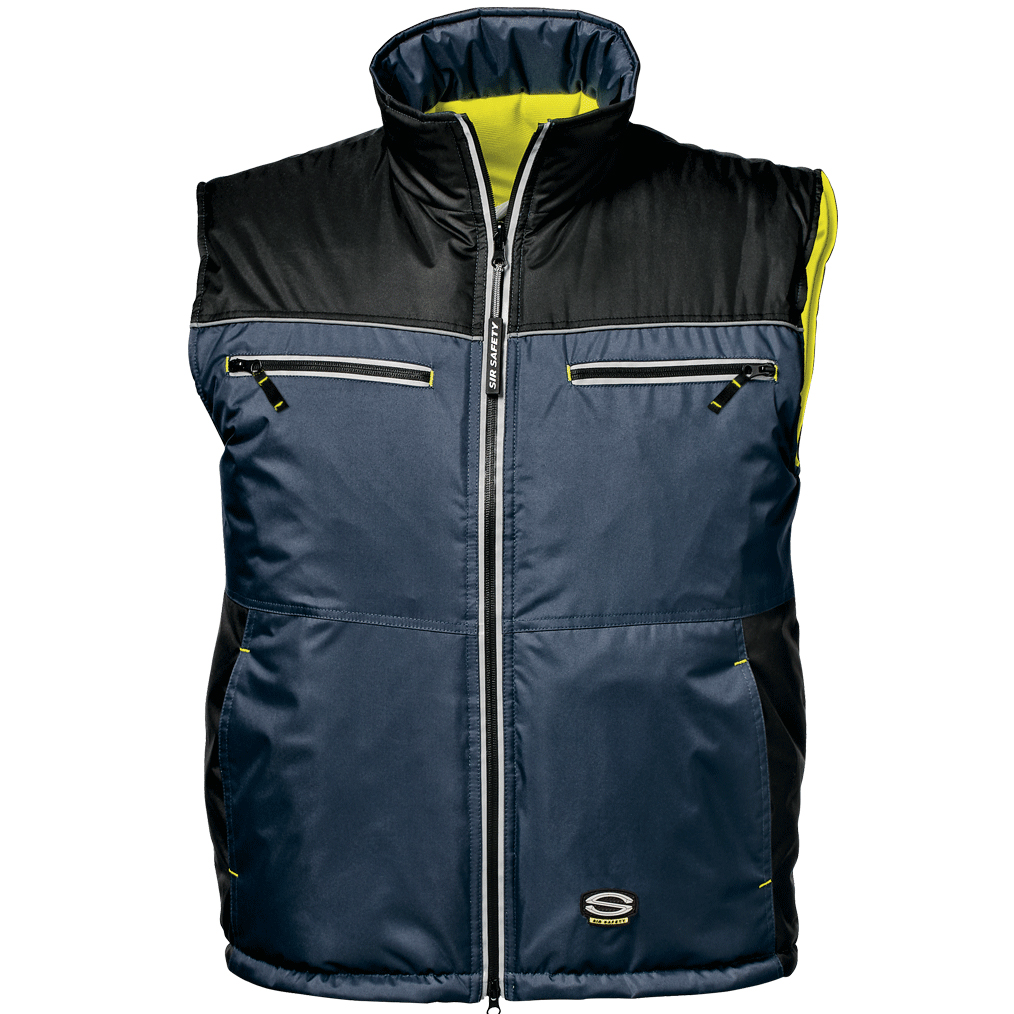 Oboustranná vesta z vnějšího materiálu Pongee s polyesterovou podšívkou o gramáži 140 g/m2 a výplní o gramáži 200 g/m2. Vybavena obousměrným zapínáním na zip, náprsními kapsami na zip a reflexním lemováním na hrudi. Na reverzní straně se nacházejí dvě kapsy s klopou a suchým zipem, D-kroužek a tepelně zatavené reflexní pruhy na ramenou, hrudi a pase. Produkt byl navržen a vyroben v souladu s nařízením (EU) 2016/425 a jeho pozdějšími změnami. Splňuje normu EN ISO 20471 třídy 2: obsahuje 0,50 m2 fluorescenčního materiálu a 0,13 m2 reflexního materiálu.