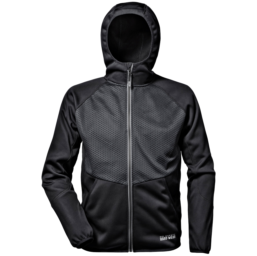 Protiskluzná fleecová tkanina, svrchní vrstva 250 g / m2, fleecová podšívka. Hrudník horní poloviny ošetřený vysokofrekvenční texturou pro větruodolný efekt; fleecová kapuce, strečové profily a raglánový střih. Moderní design