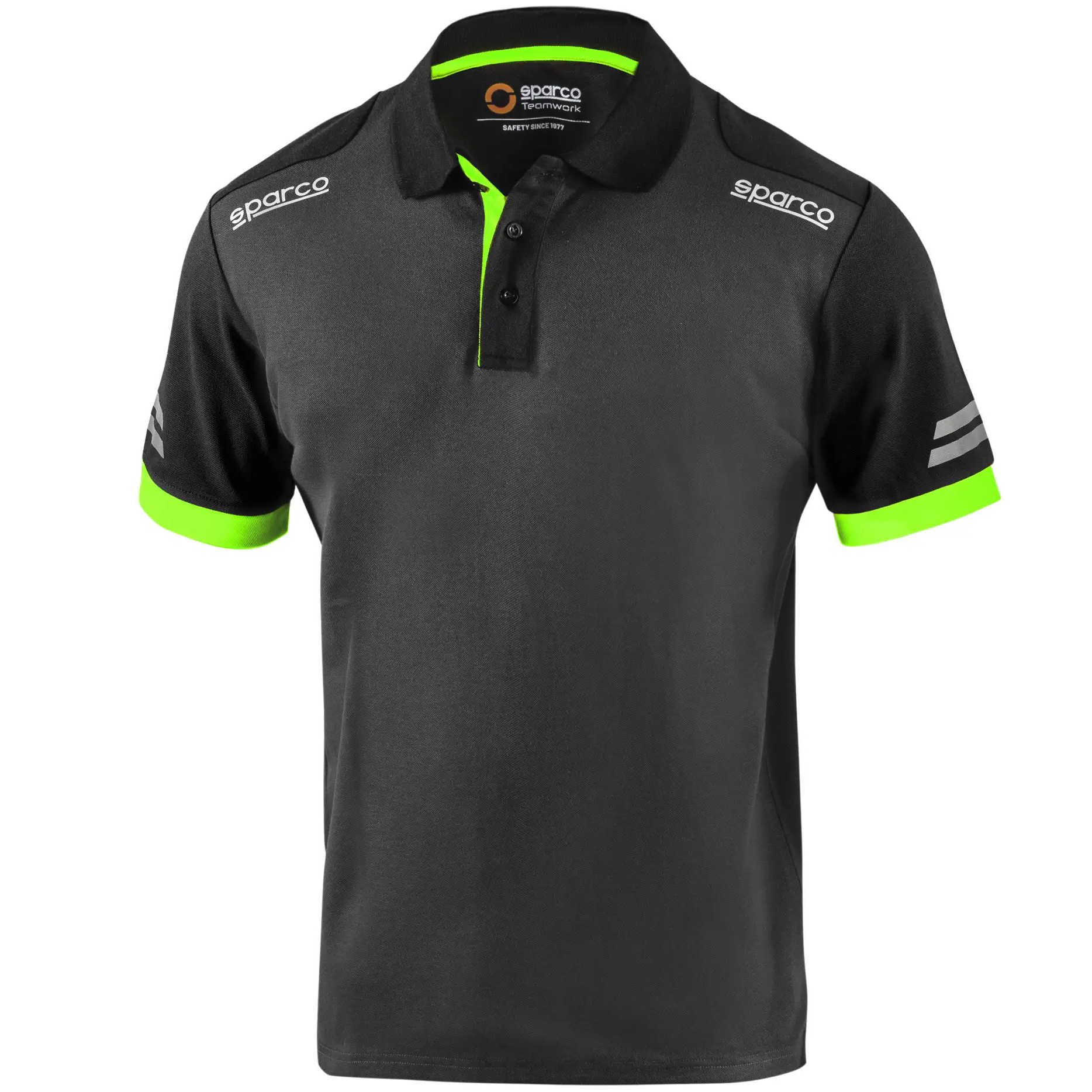 65 % bavlna - 35 % polyester s efektem pique / 180 gsm, reflexní loga Sparco, vysoce viditelné proužky na reflexních rukávech, kontrastní vložky rukávů a límce, zesílená ramena a zapínání u krku na 3 knoflíky, boční rozparky na spodní straně.