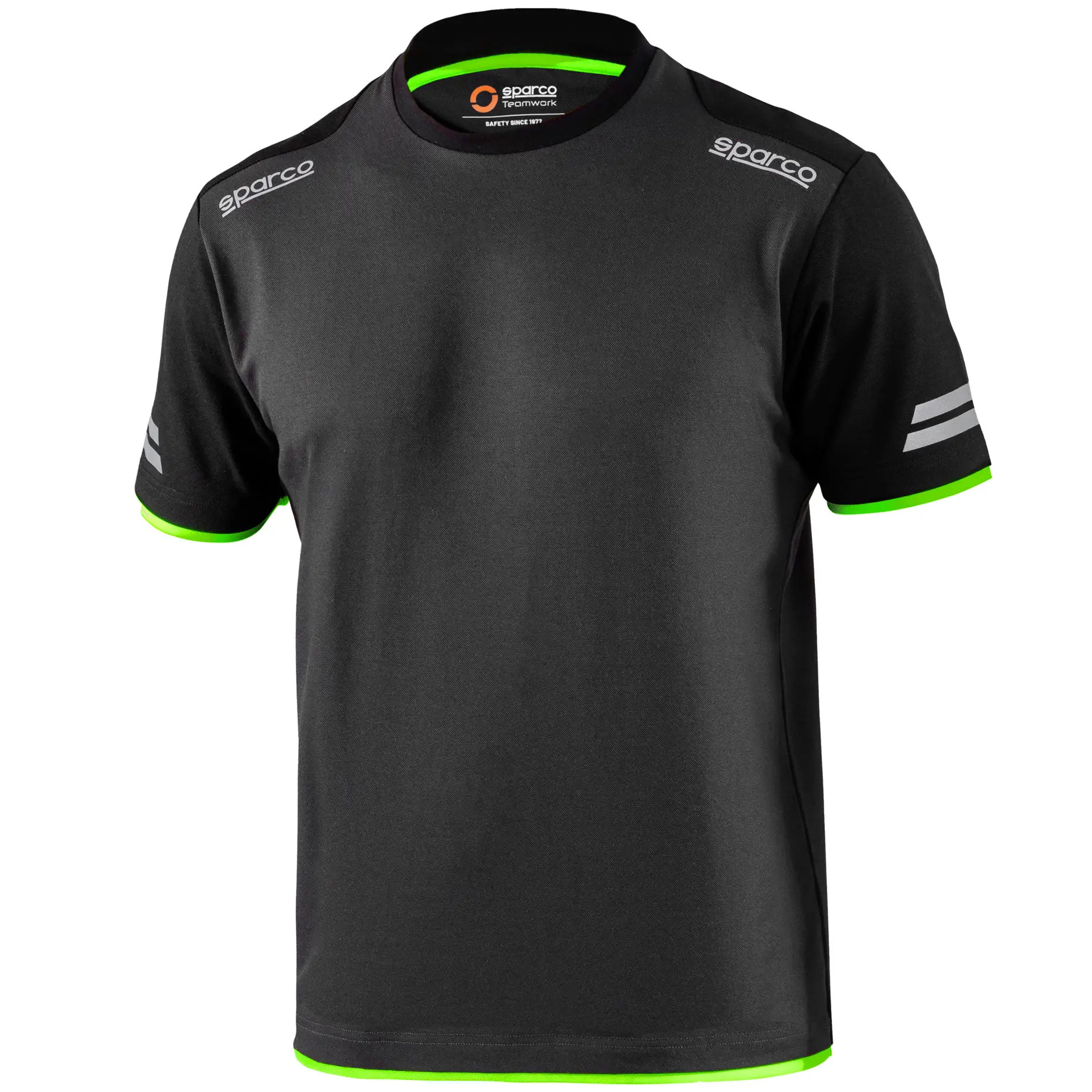 50 % bavlna - 50 % polyester s efektem pique / 170 g/m2 reflexní loga Sparco, vysoce viditelné pruhy na rukávech, zesílená ramena, kontrastní vložky.